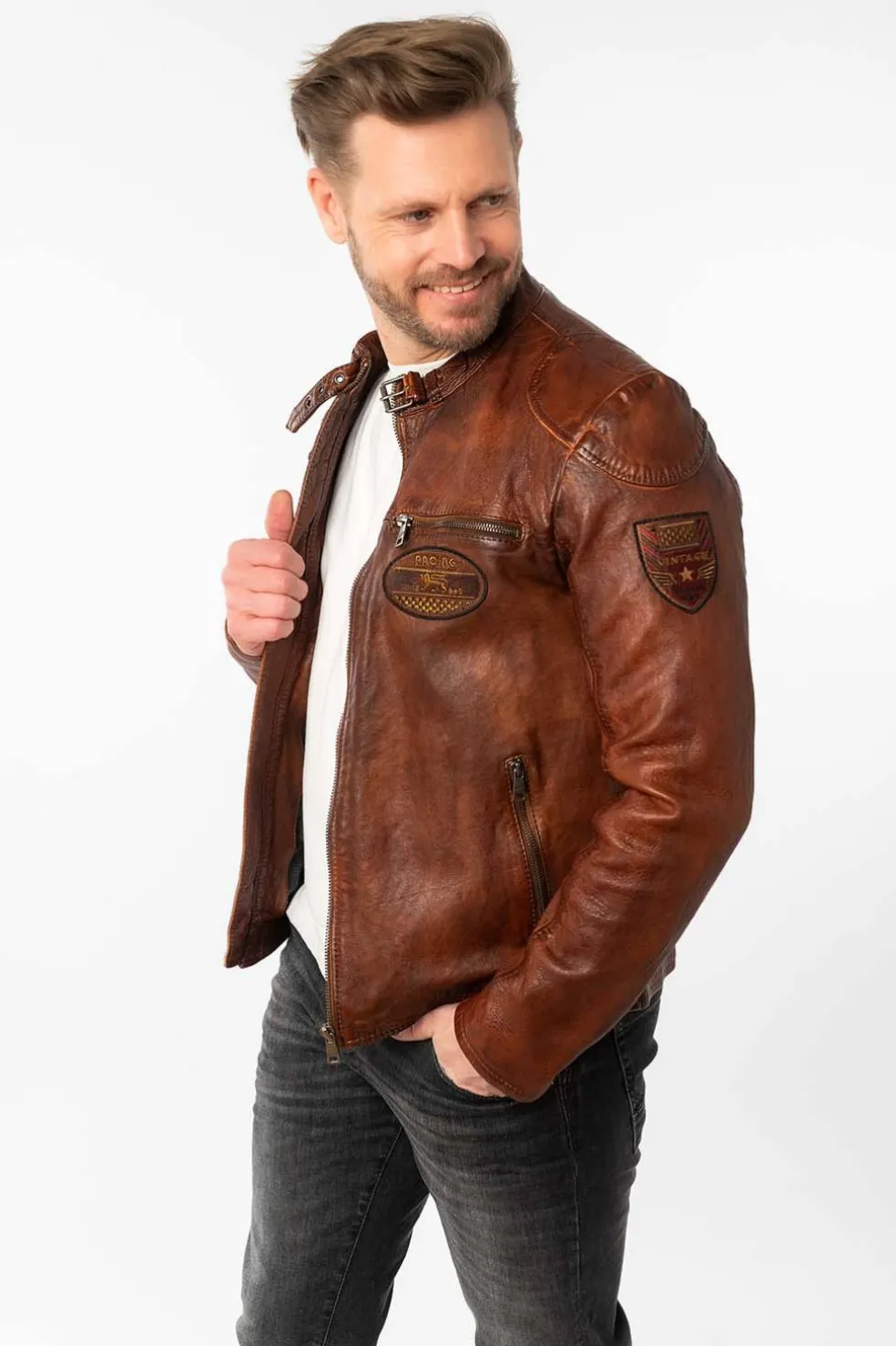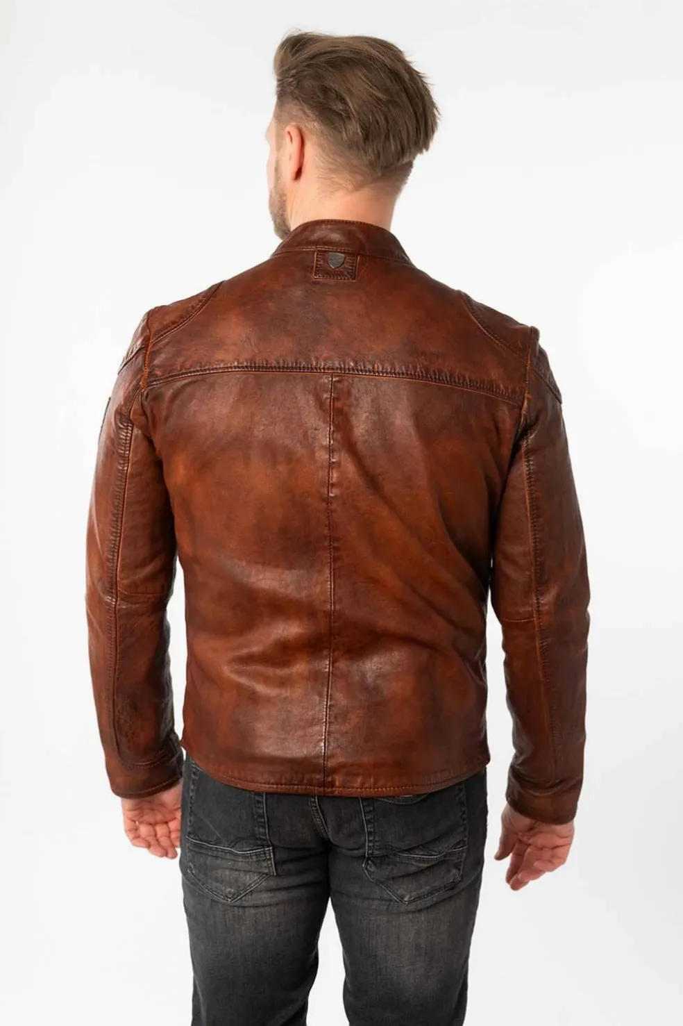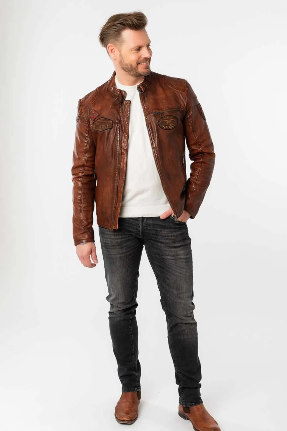 Esta cazadora de cuero de Mauritius, confeccionada en piel natural de cordero, ofrece un ajuste regular fit y un diseño moderno. Con bolsillos delanteros con cremallera, detalle de parches y cierre con cremallera.