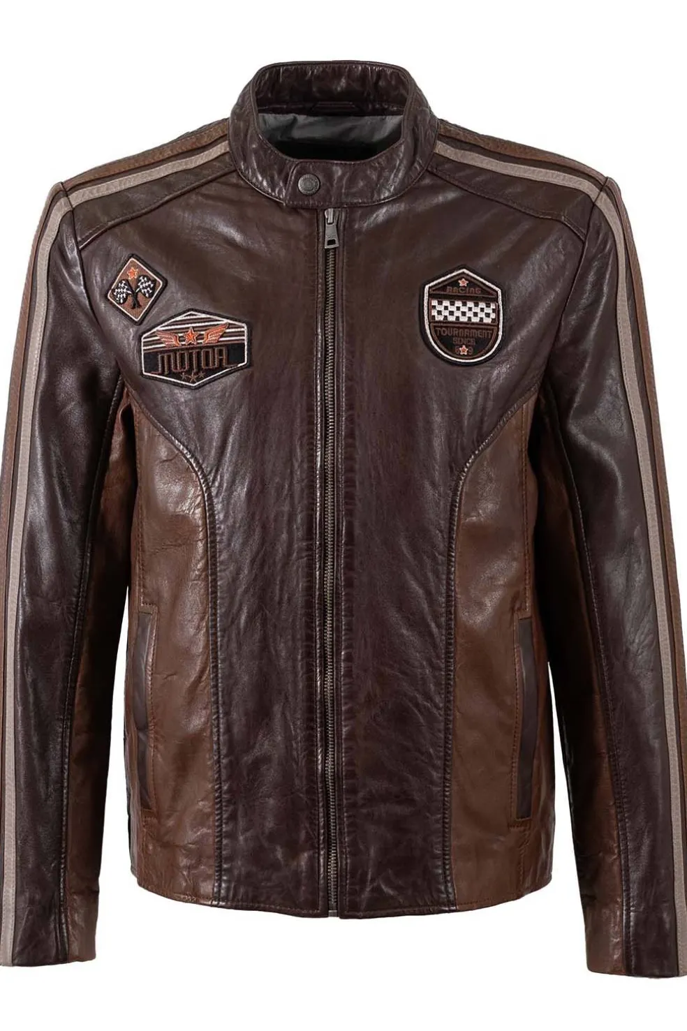 Esta cazadora de cuero de Mauritius, confeccionada en piel natural de cordero, ofrece un ajuste regular fit y un diseño moderno. Con bolsillos delanteros con cremallera, destaca por sus franjas beige y marrón desde el hombro toda la manga sobre un elegante fondo marrón efecto desgastado. Perfecta para añadir estilo a cualquier look.