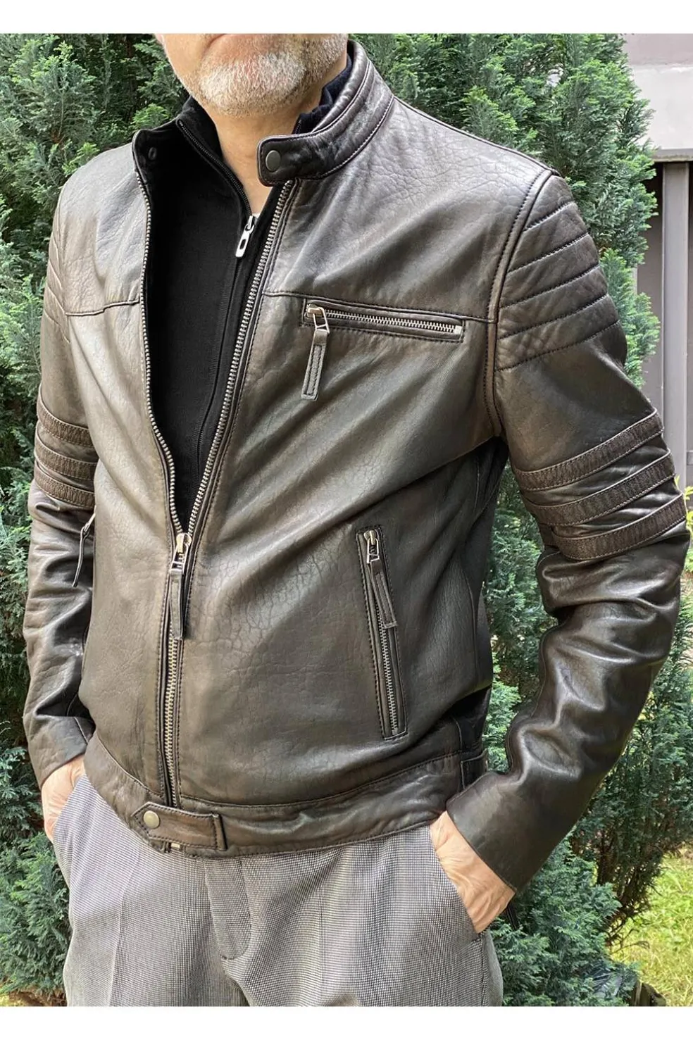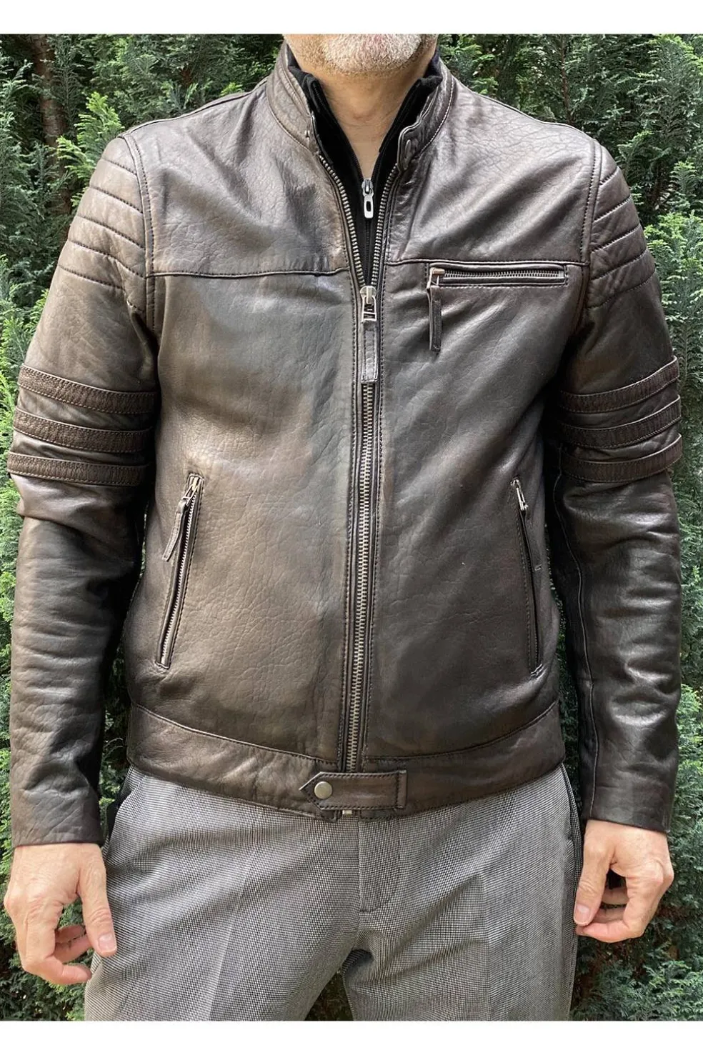 Cazadora de cuero para hombre de la marca Medinapiel, en elegante color marrón. Confeccionada en piel de cordero suave y de alta calidad, ofrece una sensación agradable al tacto y un ajuste cómodo que se adapta perfectamente al cuerpo. Cuenta con bolsillos delanteros con cremallera y bolsillos interiores para mayor funcionalidad y seguridad. Los detalles en los brazos aportan un toque distintivo y moderno a su diseño. Ideal para un estilo casual sofisticado, esta cazadora combina comodidad, durabilidad y estilo en una sola prenda.