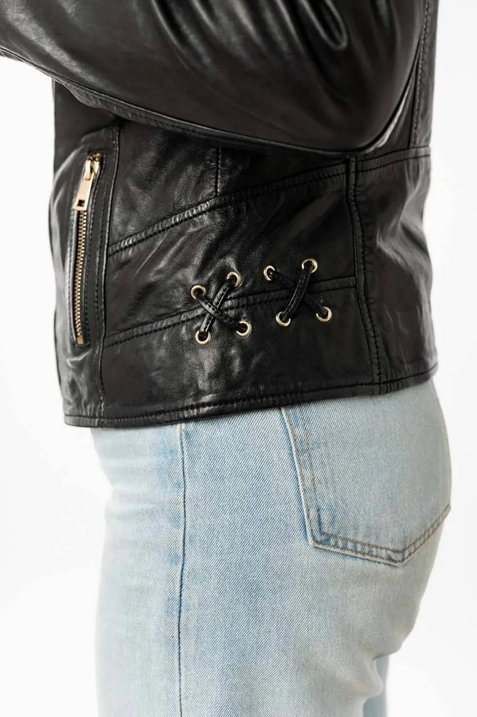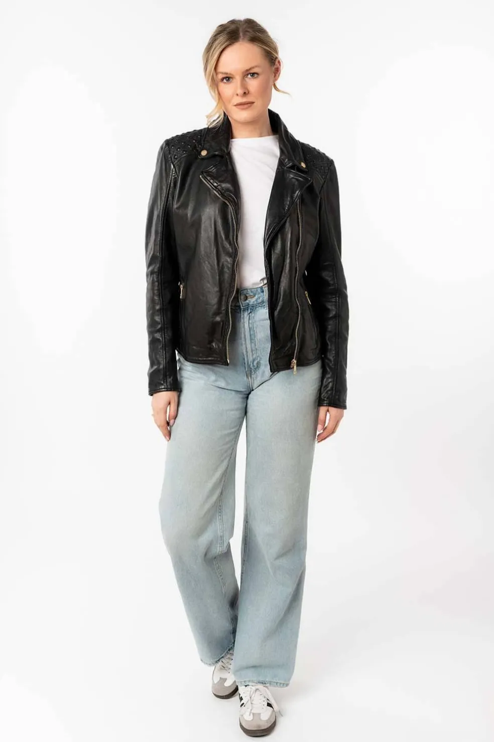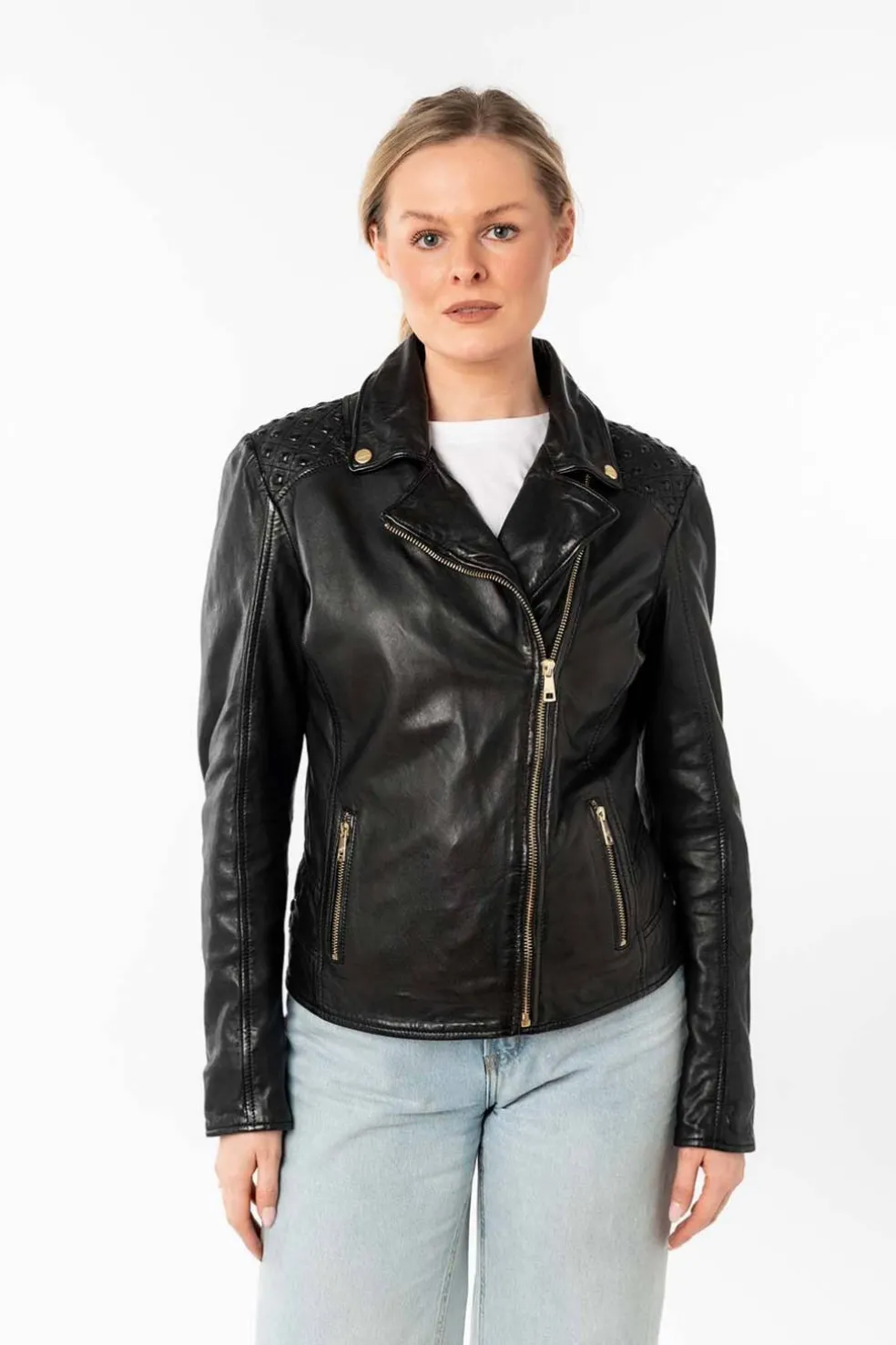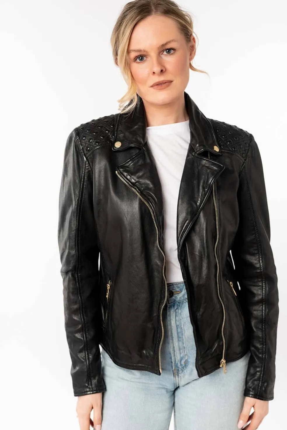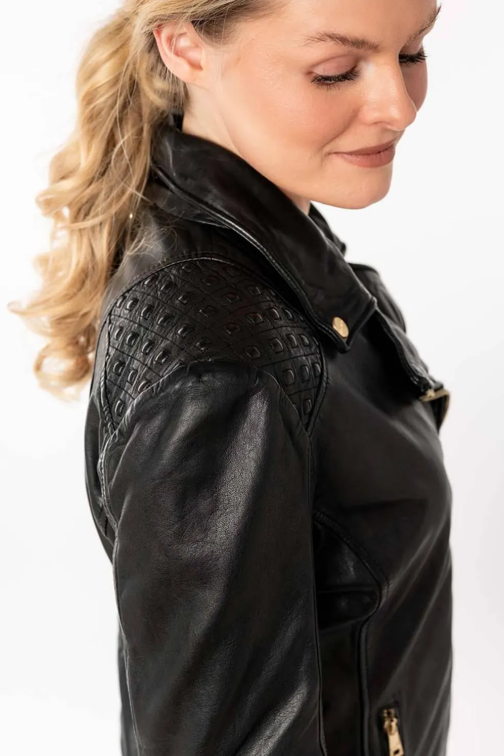 La cazadora de mujer mauritius Chlara en color negro con cremallera cruzada en dorado y detalles en los hombros suena como una prenda muy elegante y moderna. Es perfecta para un estilo atrevido y sofisticado