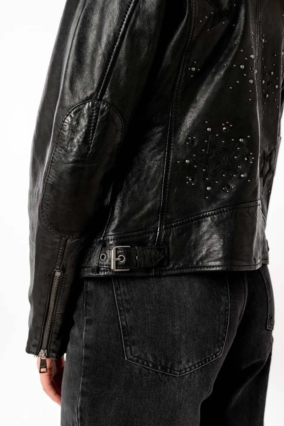 Cazadora de cuero para señora con tachuelas y estrellas en la parte de la espalda. Es una prenda muy estilizada y moderna, perfecta para darle un toque atrevido a tu look.