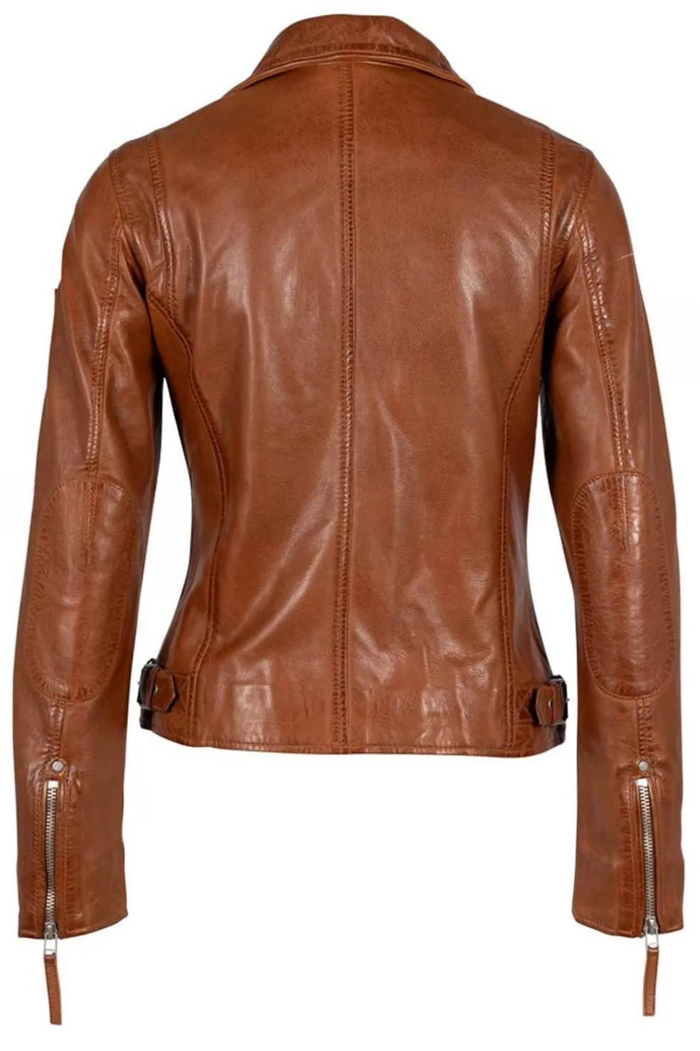 Eleva tu estilo con la cazadora de cuero color coñac de Mauritius. Con un corte regular fit y una cremallera central asimétrica, esta prenda combina modernidad y elegancia. Dispone de tres bolsillos delanteros con cremallera y un bolsillo interior para mayor funcionalidad. Las cremalleras en las mangas y las cintas en la cintura permiten un ajuste personalizado, asegurando comodidad y versatilidad. Perfecta para cualquier ocasión, esta cazadora es un imprescindible en el armario de la mujer contemporánea.
