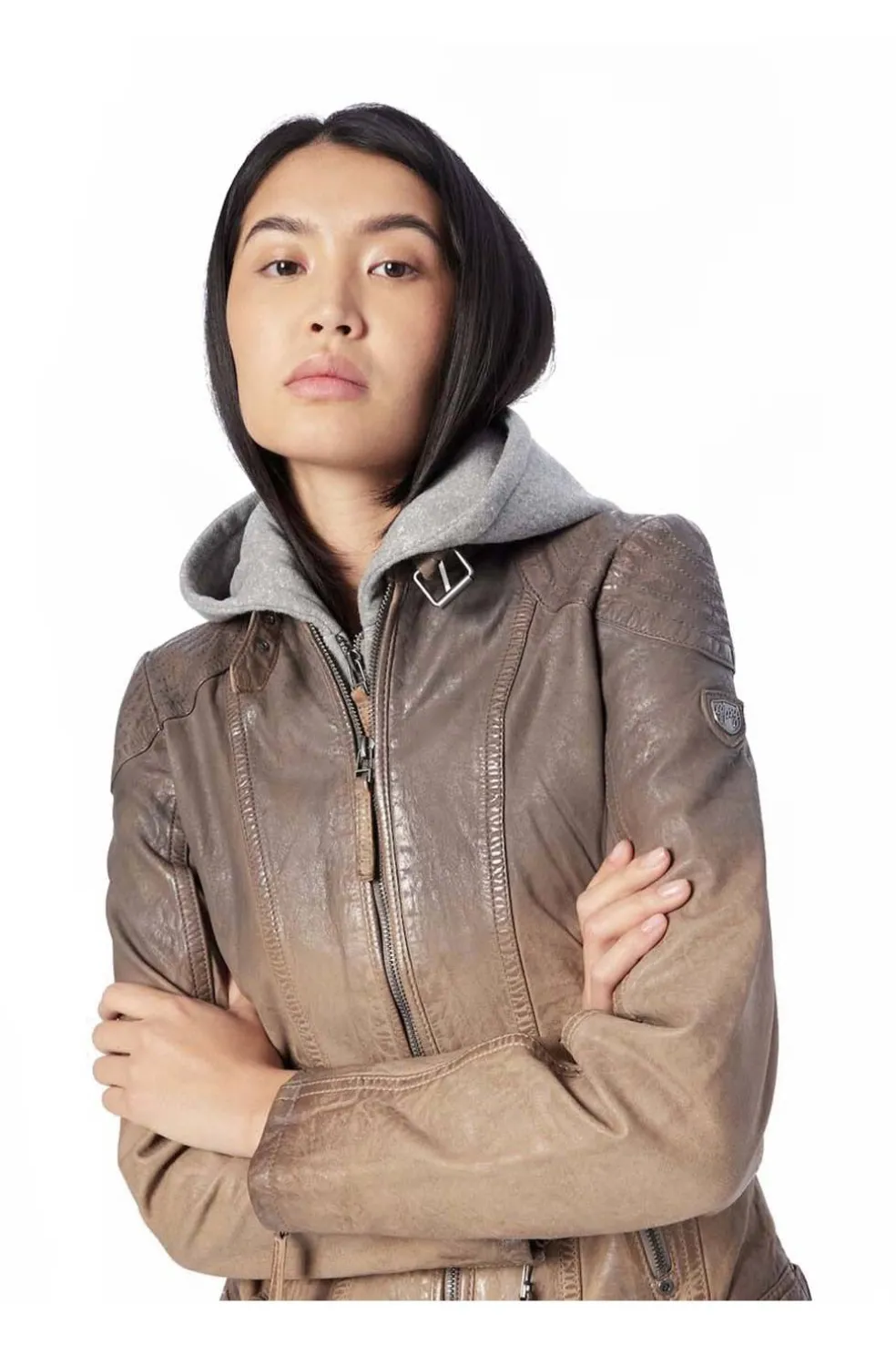 Cazadora de cuero natural con capucha de tejido desmontable, estilo motera . Exterior 100% piel. Largo: 53cm. Acabado vintage. Talla normal, patrón regular.