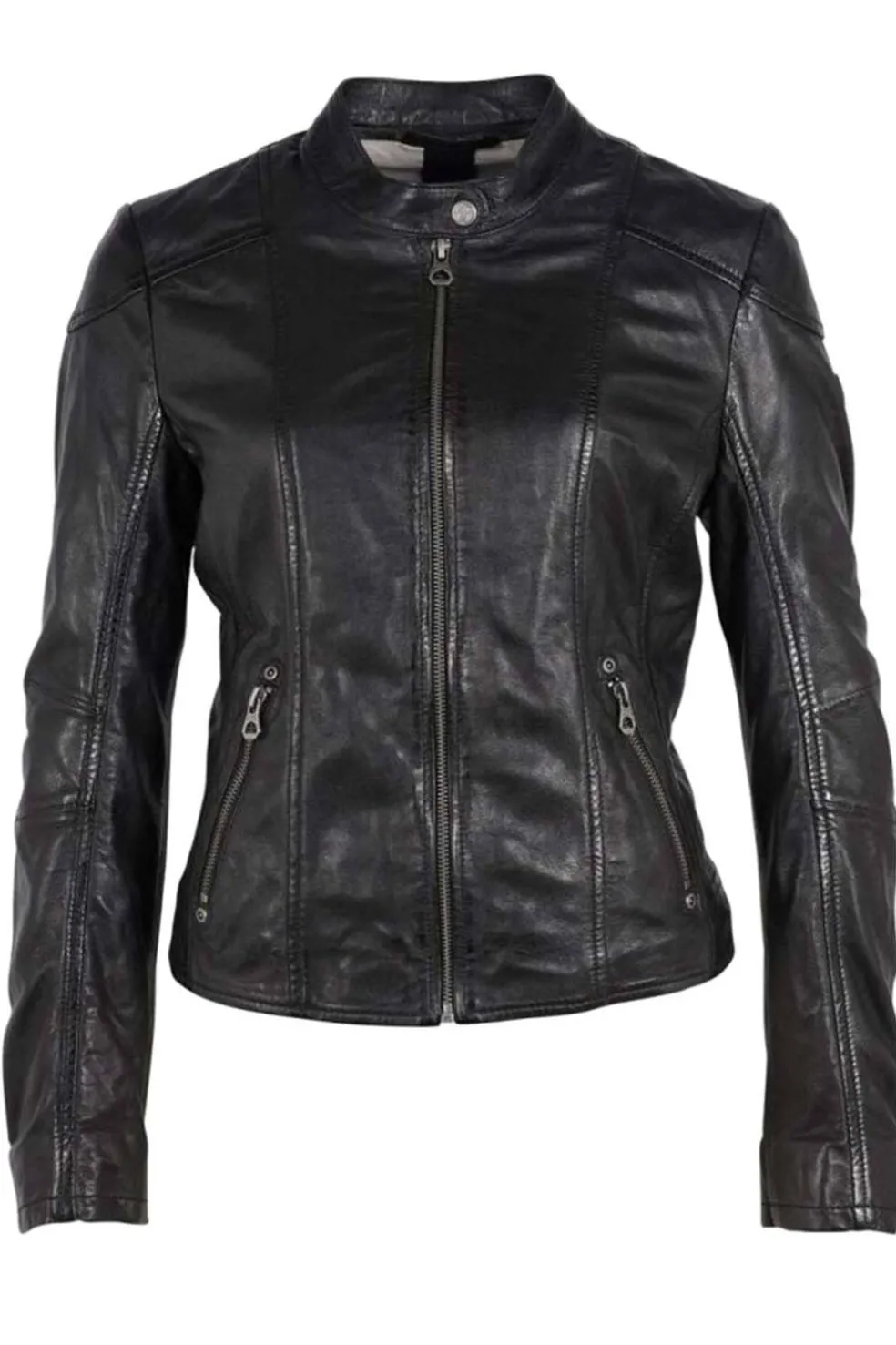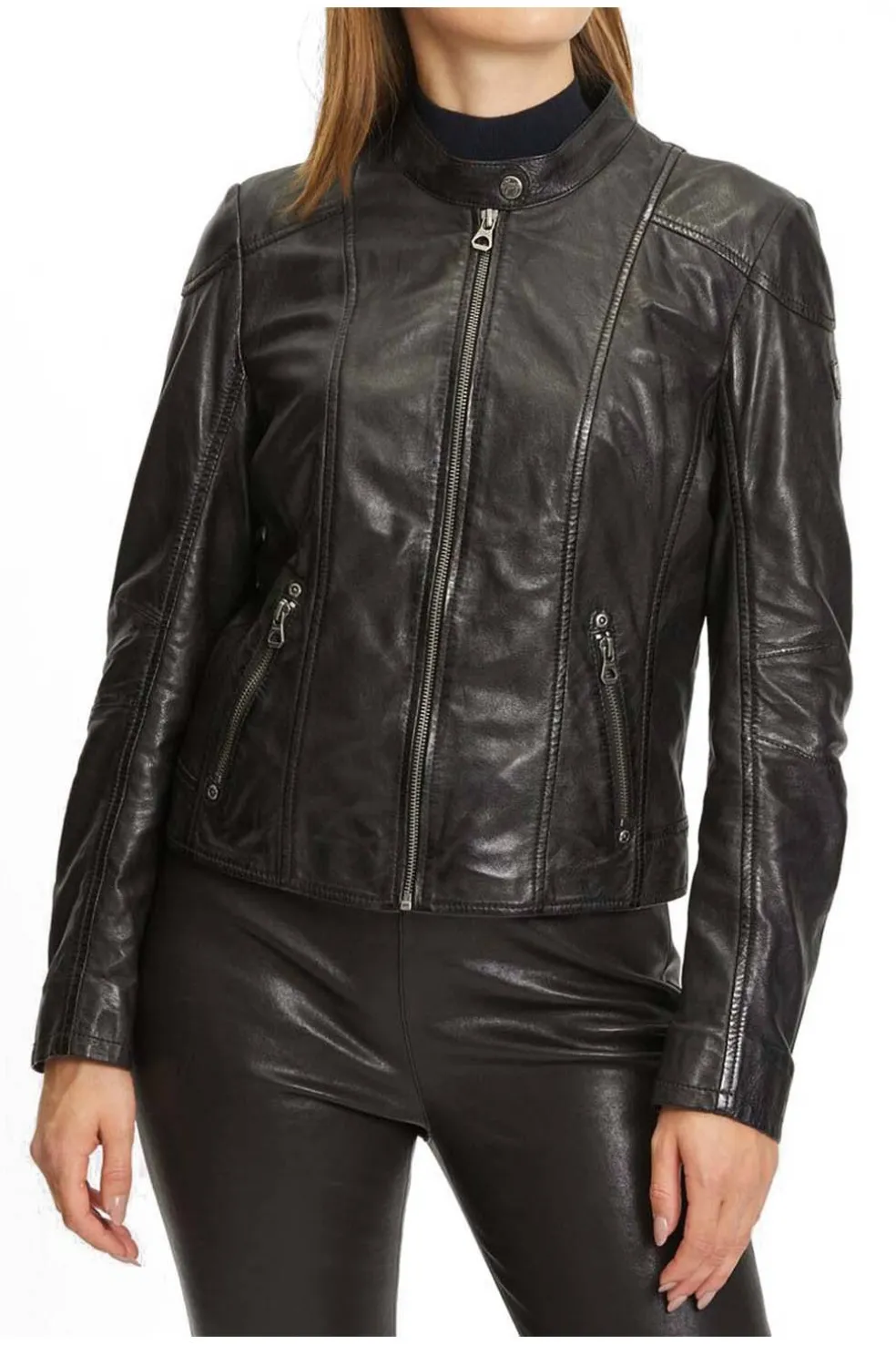 Cazadora de cuero estilo motero. Bolsillos laterales, cierre central y puños con cremallera. Largo de la prenda: 52 cm