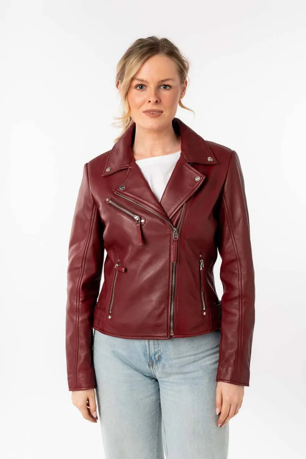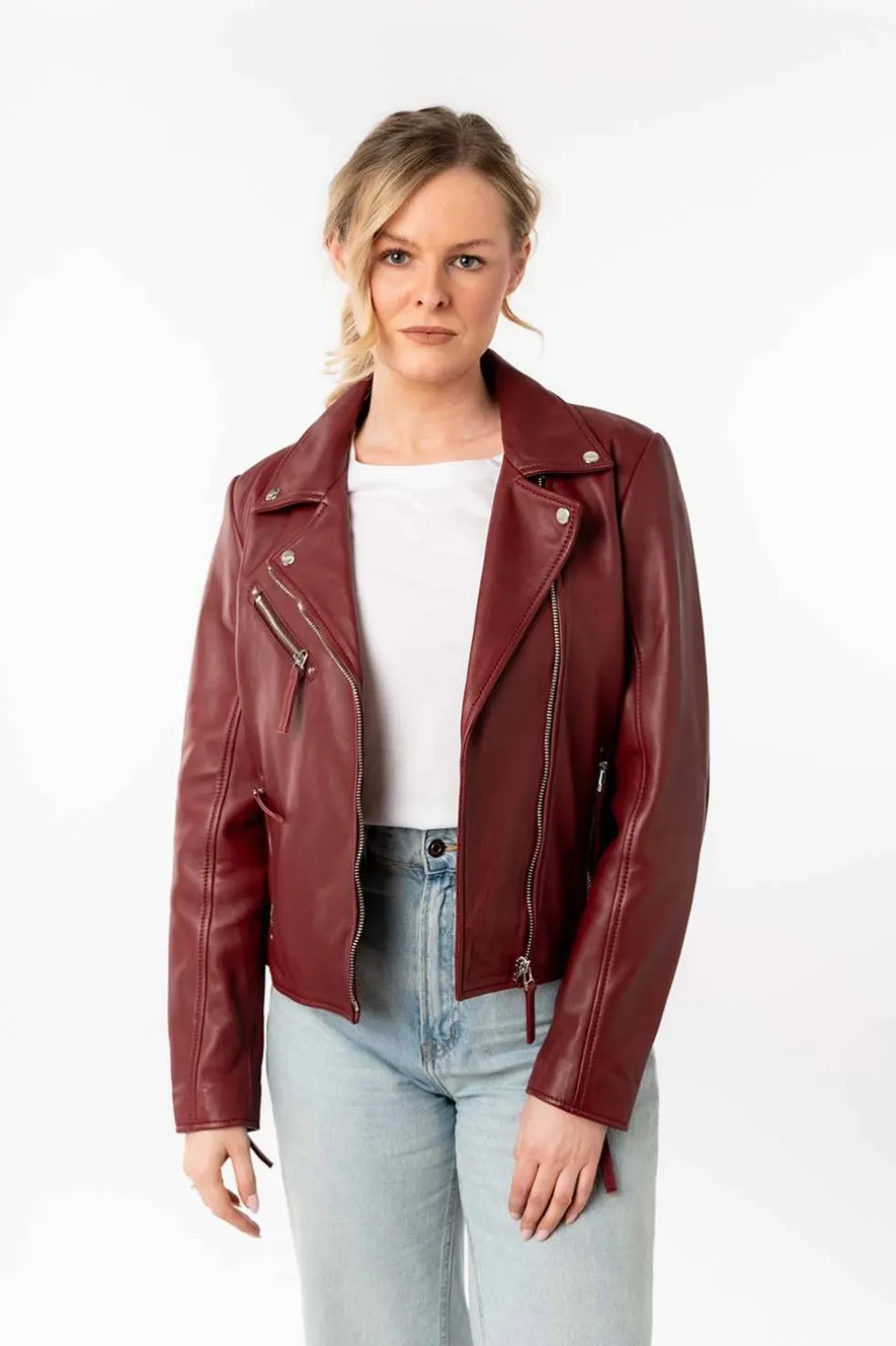 Esta cazadora de cuero en un vibrante color rojo es una declaración de estilo por sí sola. Su diseño cruzado tipo biker le aporta un aire rebelde y contemporáneo, ideal para mujeres seguras de sí mismas que no temen destacar.