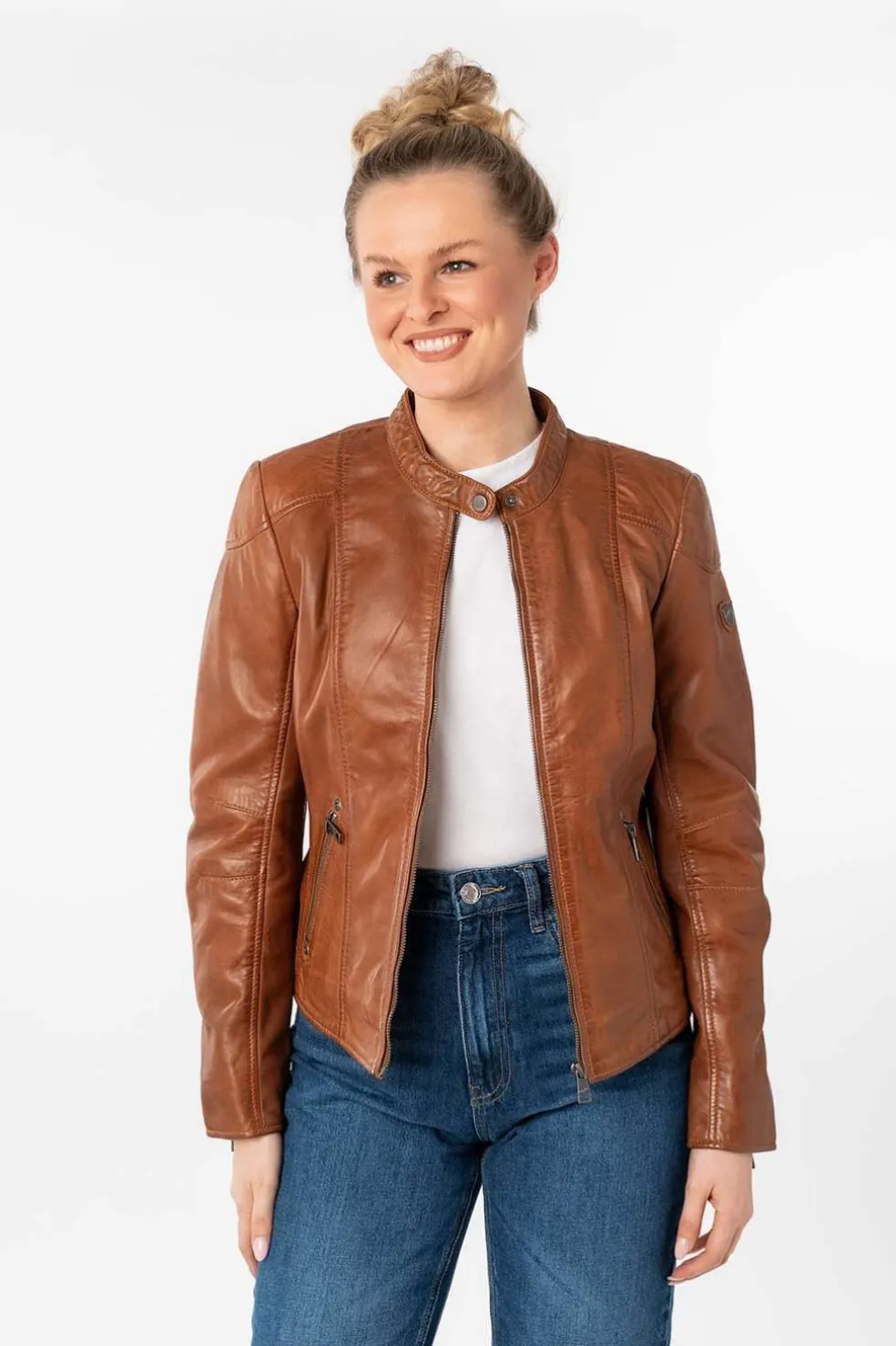 Cazadora de cuero estilo motero. Bolsillos laterales, cierre central y puños con cremallera. Largo de la prenda: 52 cm