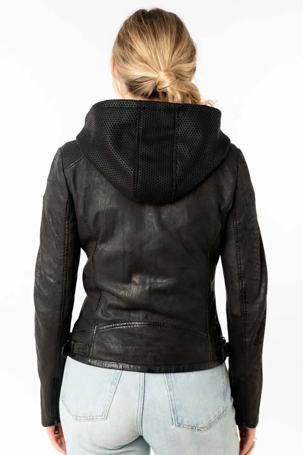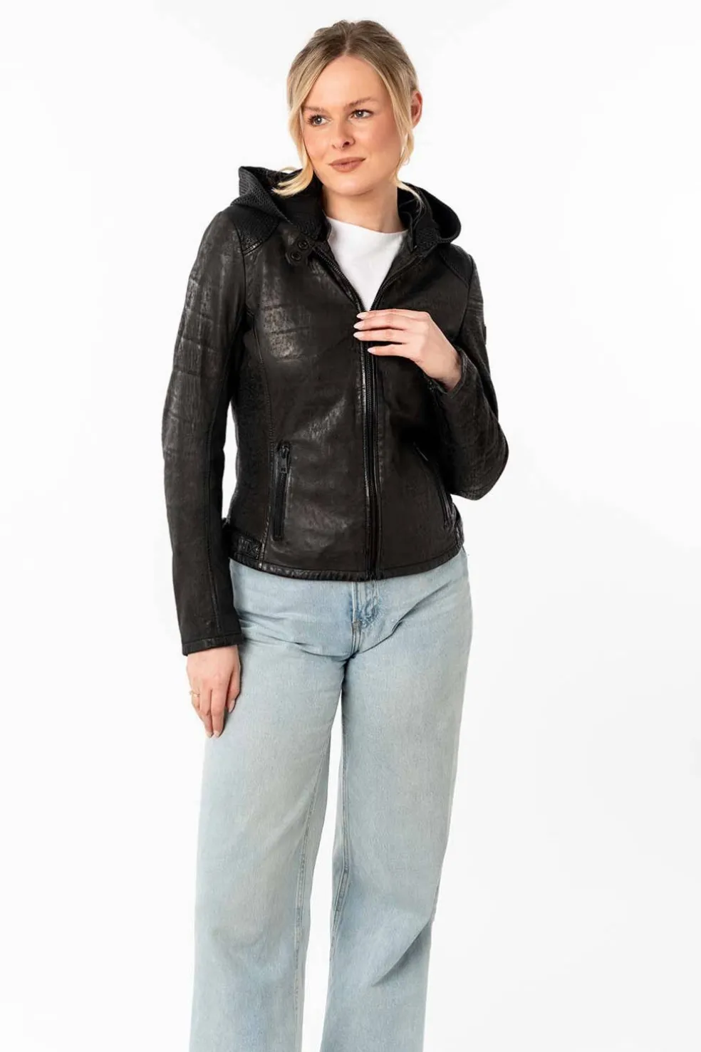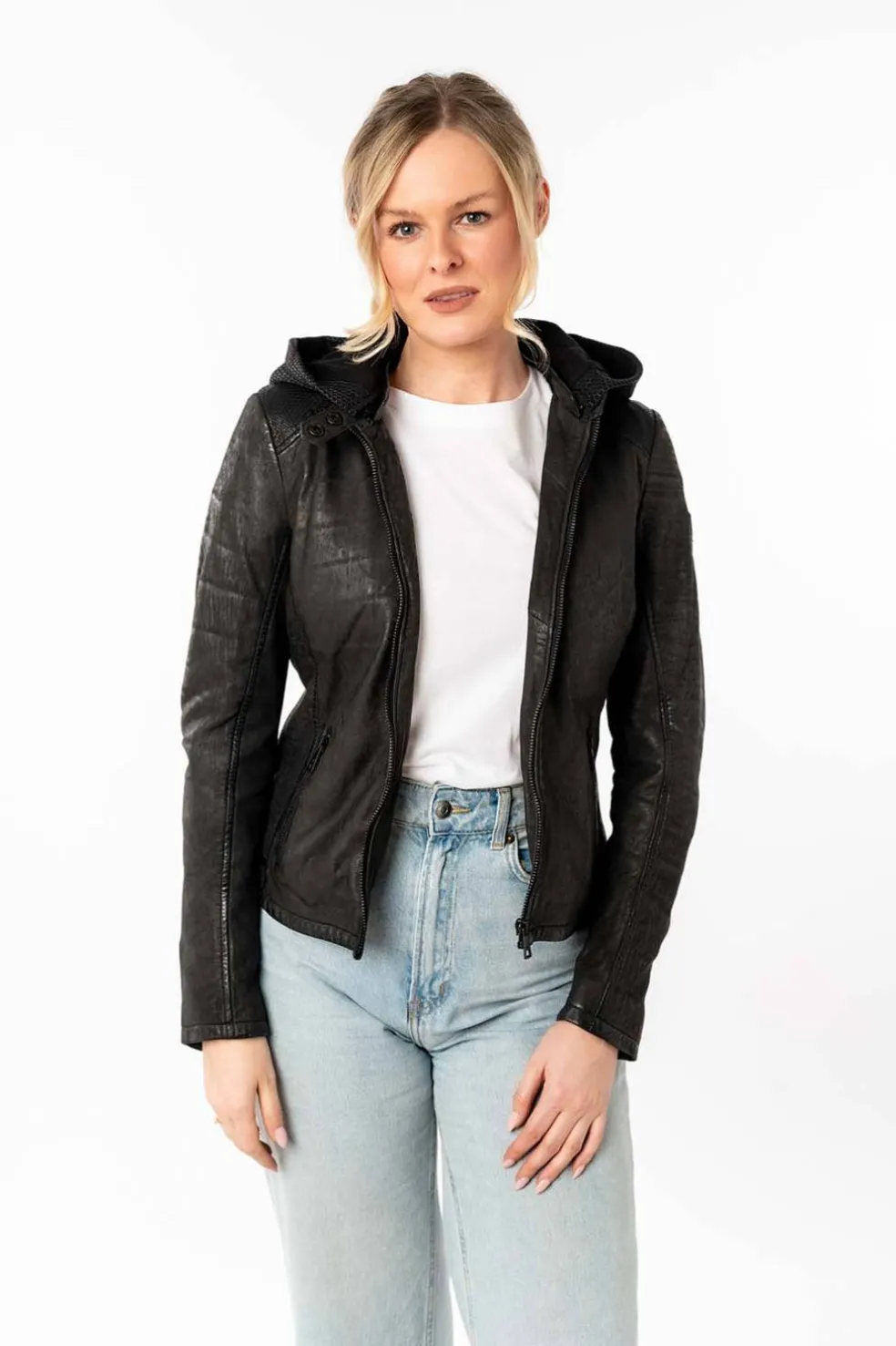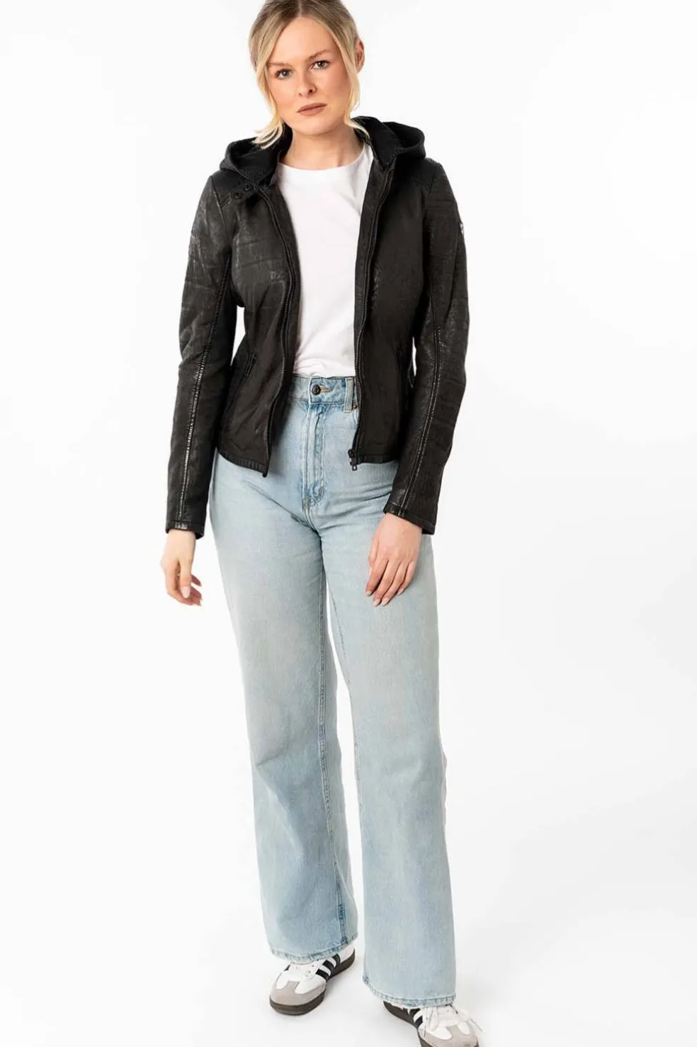 La cazadora de cuero modelo Aydana combina estilo clásico con detalles funcionales que marcan la diferencia. Su diseño en color negro, con cremallera central y capucha desmontable del mismo tono, la convierten en una prenda práctica y versátil, ideal para el día a día con un toque moderno.