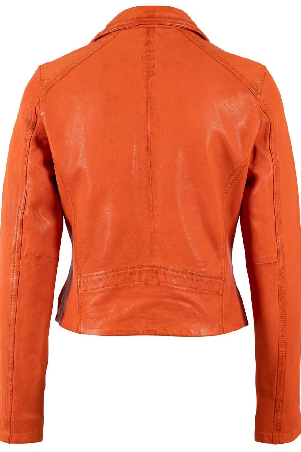 Cazadora de cuero para mujer modelo Mishell en color naranja, con detalles de cremalleras negras. Un diseño atrevido y sofisticado que combina estilo y personalidad.