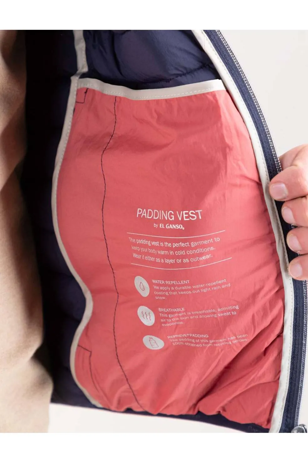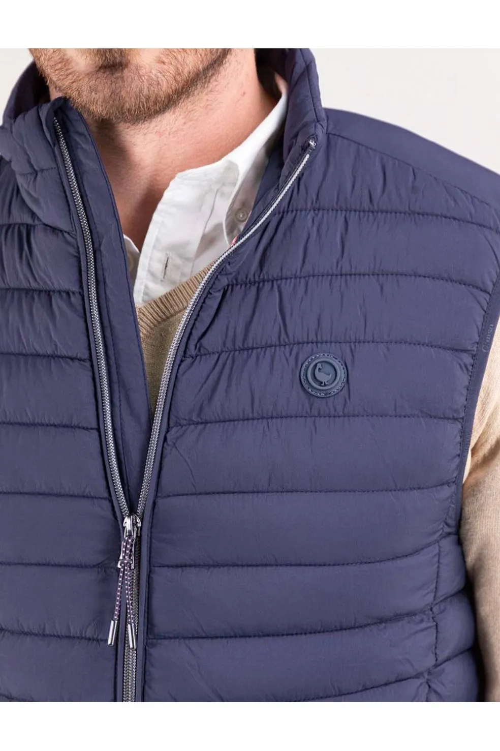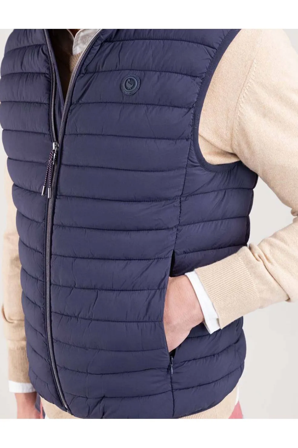 Chaleco de hombre acolchado confeccionado en nylon reciclado, repelente al agua. Su diseño Slim Fit proporciona un ajuste moderno y estilizado. Cuenta con cremallera central acompañada de un detalle de bandera de 3 mm en el interior, sisa elástica para mayor comodidad. Dispone de bolsillos frontales con cremallera y un bolsillo interior adicional. El logo, con acabado engomado, ubicado en el pecho.