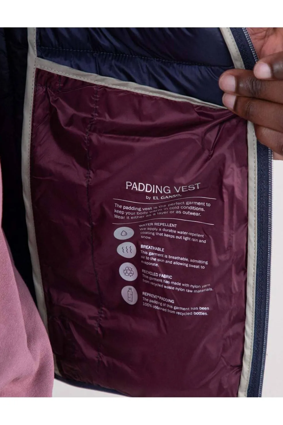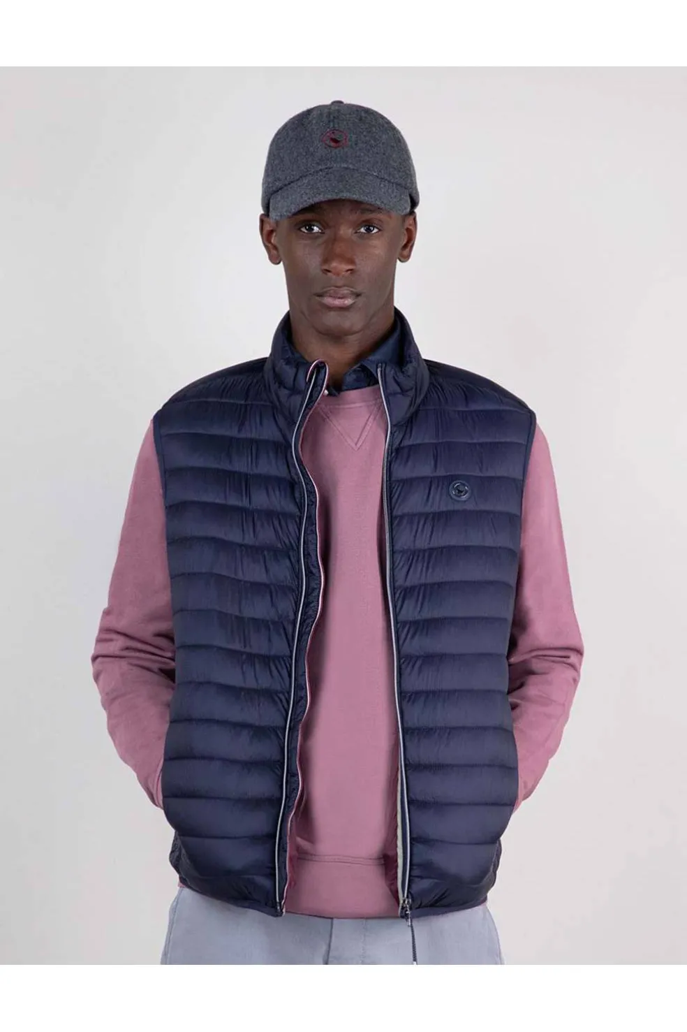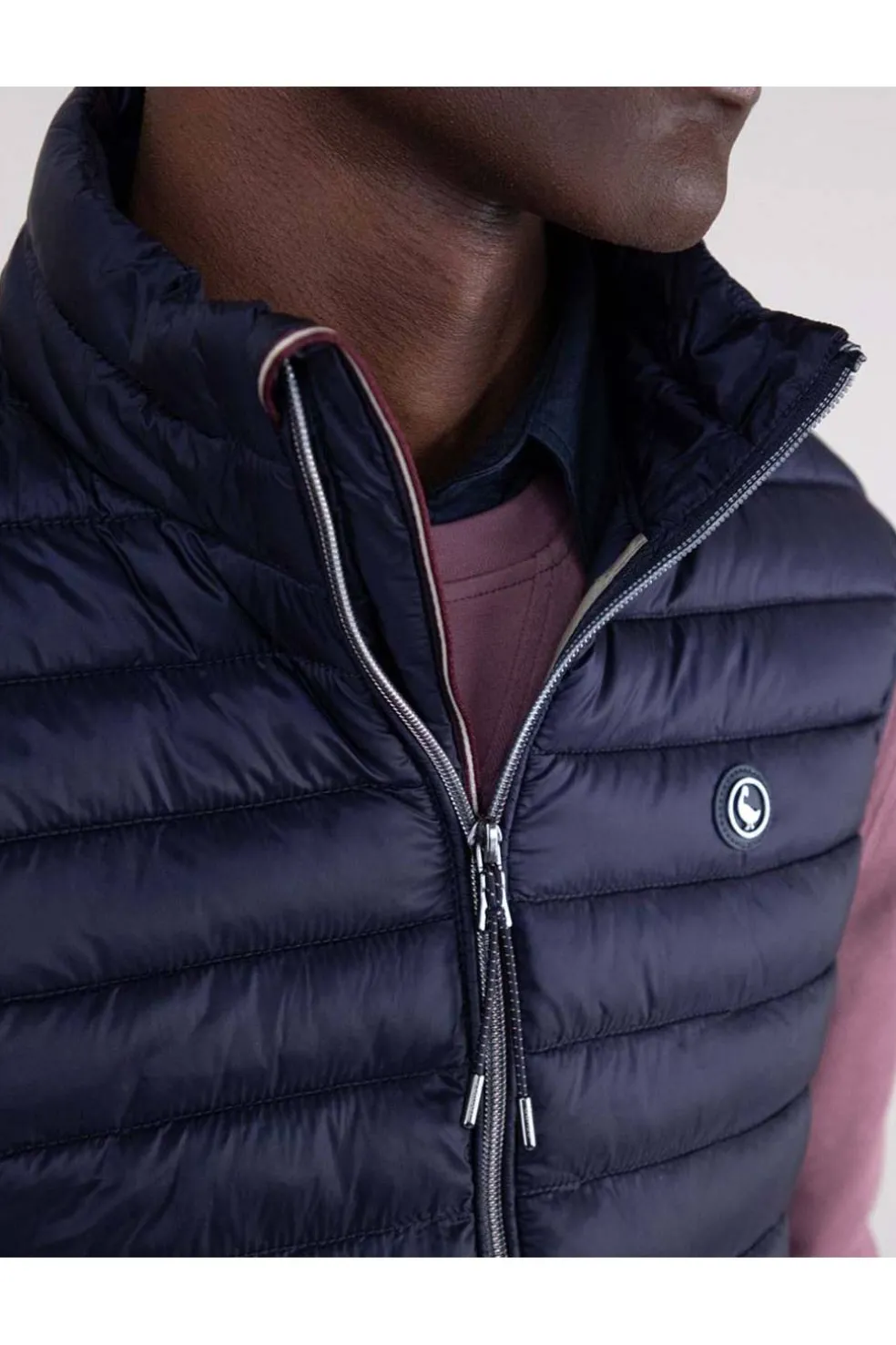 Chaleco de hombre acolchado de nylon reciclado repelente al agua. El patrón es Slim Fit, tiene una cremallera con un detalle de cinta de 3mm en el interior y una sisa elástica. Bolsillos con cremallera en la parte frontal y bolsillo interior. Logo metálico en el pecho.