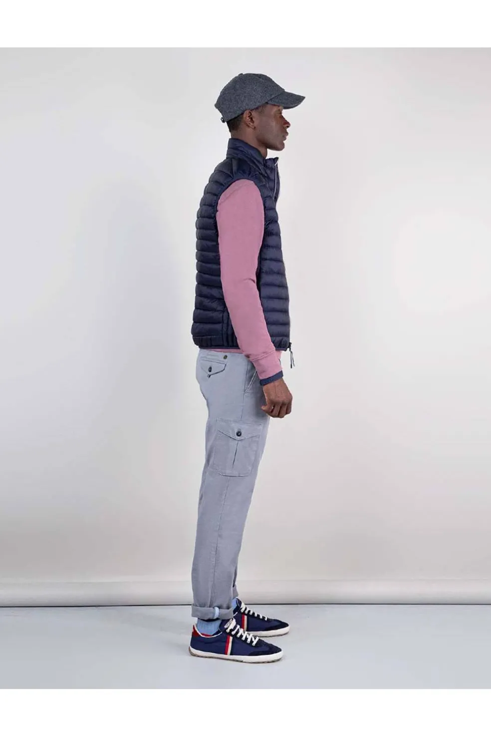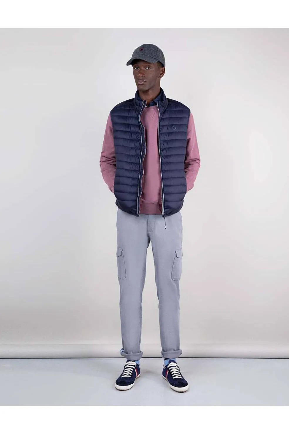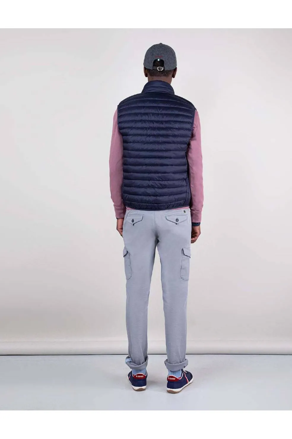 Chaleco de hombre acolchado de nylon reciclado repelente al agua. El patrón es Slim Fit, tiene una cremallera con un detalle de cinta de 3mm en el interior y una sisa elástica. Bolsillos con cremallera en la parte frontal y bolsillo interior. Logo metálico en el pecho.