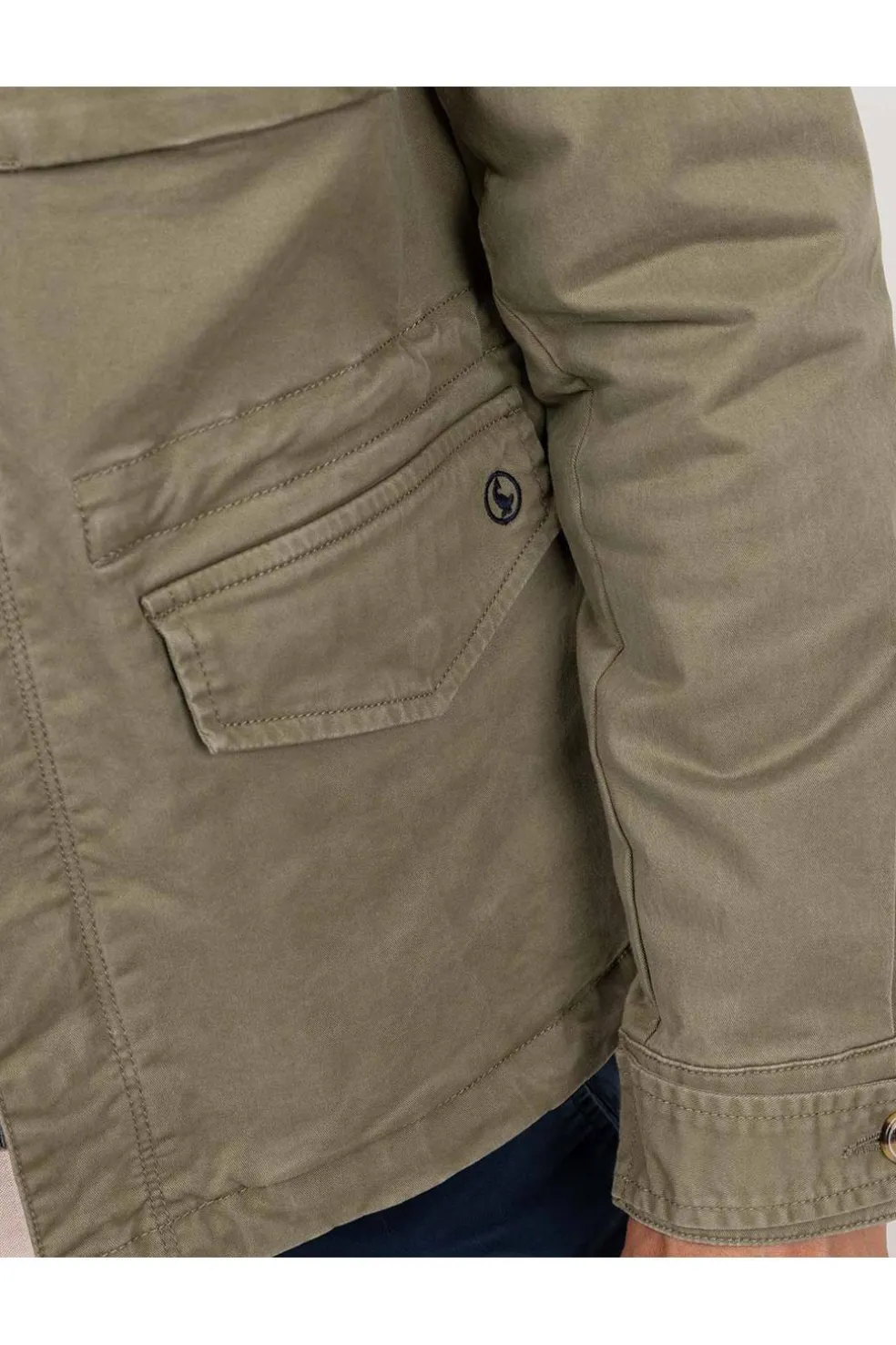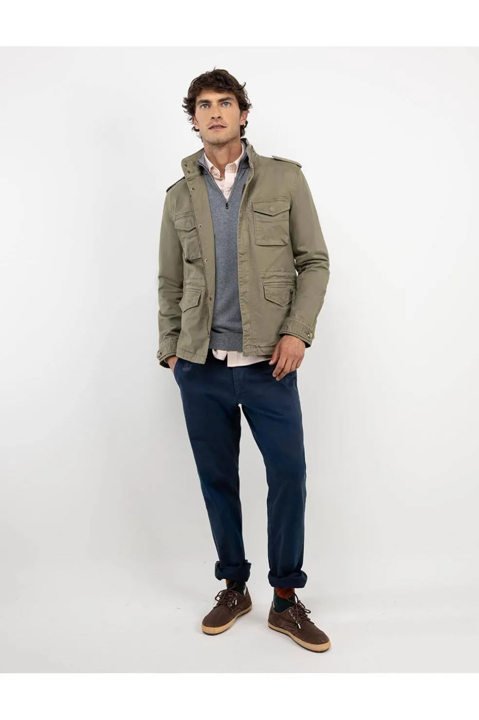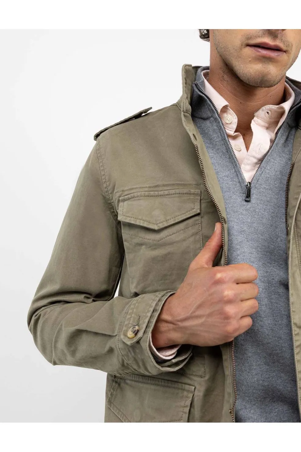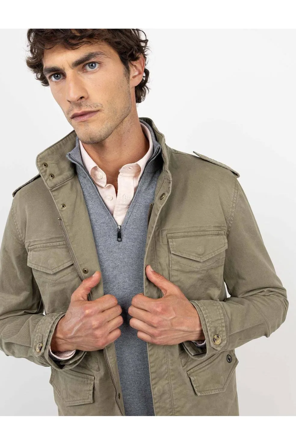 Chaqueta de hombre confeccionada en algodón con elastán para una mayor comodidad. Corte Regular Fit, cuello alto, múltiples bolsillos tipo cargo con tapeta y cierre mediante cremallera oculta por tapeta con botones tipo snap. Manga larga terminada en puño con tira abotonada y cintura ajustable mediante cordón.