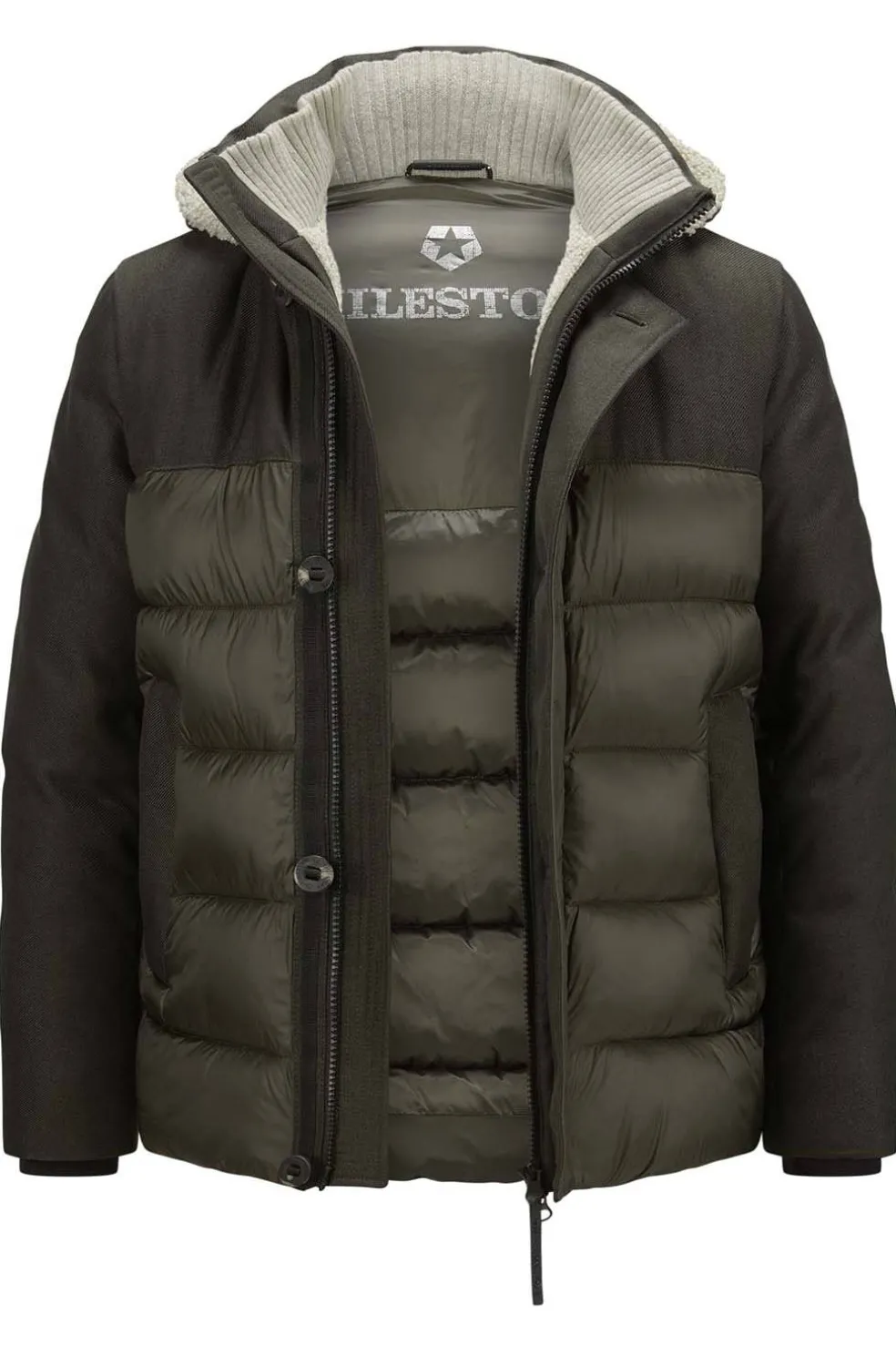 Chaqueta en mezcla de materiales con acolchado innovador de MILESTONE. El cálido confort está garantizado con esta chaqueta. El modelo convence por su mezcla de materiales y está equipado con una capucha extraíble y un acolchado reciclado.