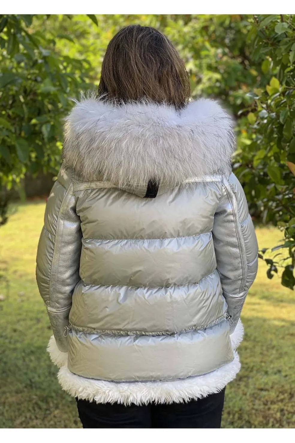 La chaqueta de plumas SAYURI en tono gris es perfecta para dar estilo a todos tus looks esta temporada, con largo a la cadera, detalles de pelo en la parte baja y mangas de color blanco roto, parte trasera acolchada, parte delantera efecto metalizado, pelo en la capucha color blanco, cierre con cremallera y botones, bolsillos laterales.