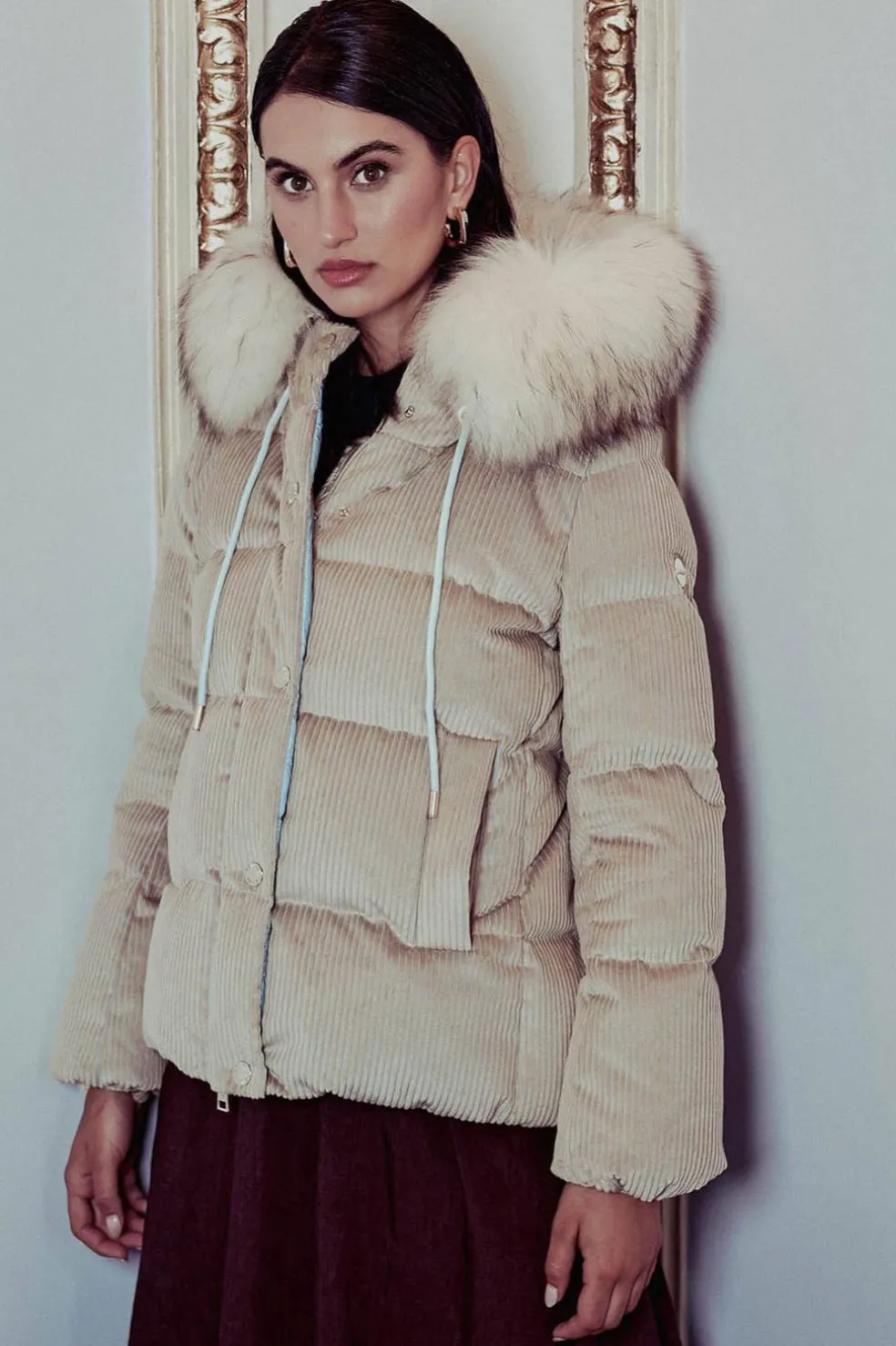 Chaqueta de mujer Donjaz con un diseño elegante y funcional. Su exterior presenta un acabado efecto pana que aporta textura y estilo, mientras que el interior en color azul ofrece un contraste atractivo y cómodo. Incorpora pelo natural que realza su aspecto sofisticado y proporciona abrigo adicional. El logo distintivo de la marca se encuentra en el brazo, añadiendo un detalle de identidad exclusivo. La prenda cuenta con prácticos bolsillos laterales con cierre de corchetes, perfectos para resguardar las manos o pequeños objetos. Su cierre central combina cremallera y corchetes, asegurando mayor protección frente al frío y un ajuste seguro. Una pieza versátil y atemporal, ideal para combinar calidez, confort y estilo en los días más fríos.