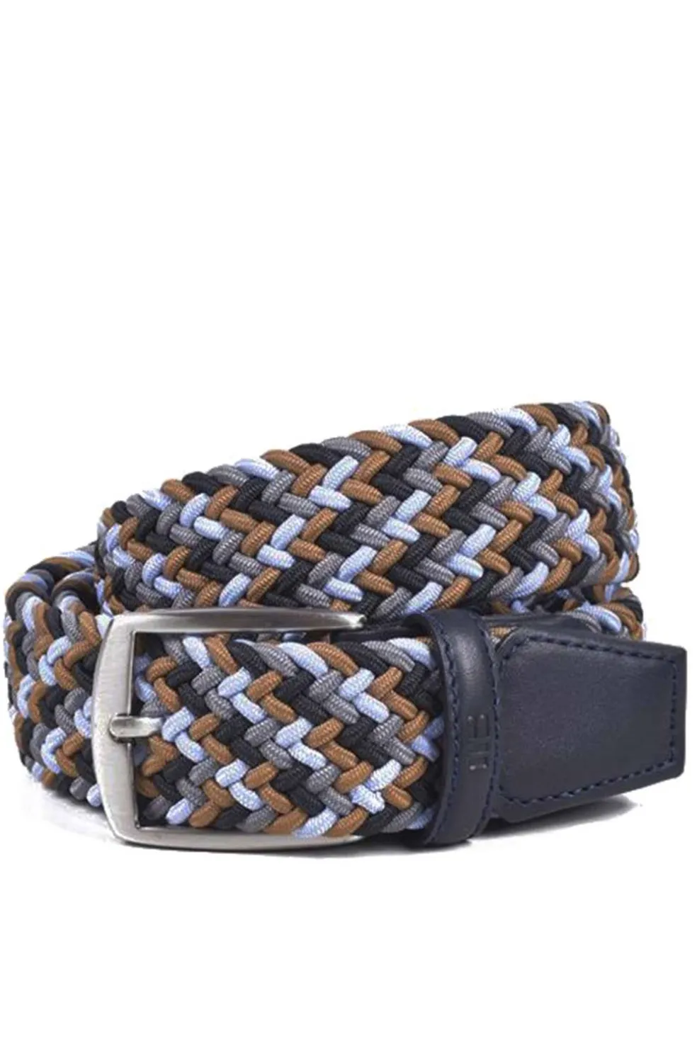 Cinturón textil trenzado con detalles en auténtica piel de vacuno. Su elasticidad facilita un cómodo ajuste en la cintura. Un modelo muy versátil, que se abrocha en la misma trenza. Pasador de piel identificado a fuego con la marca. Hebilla metálica en acabado níquel satinado.
