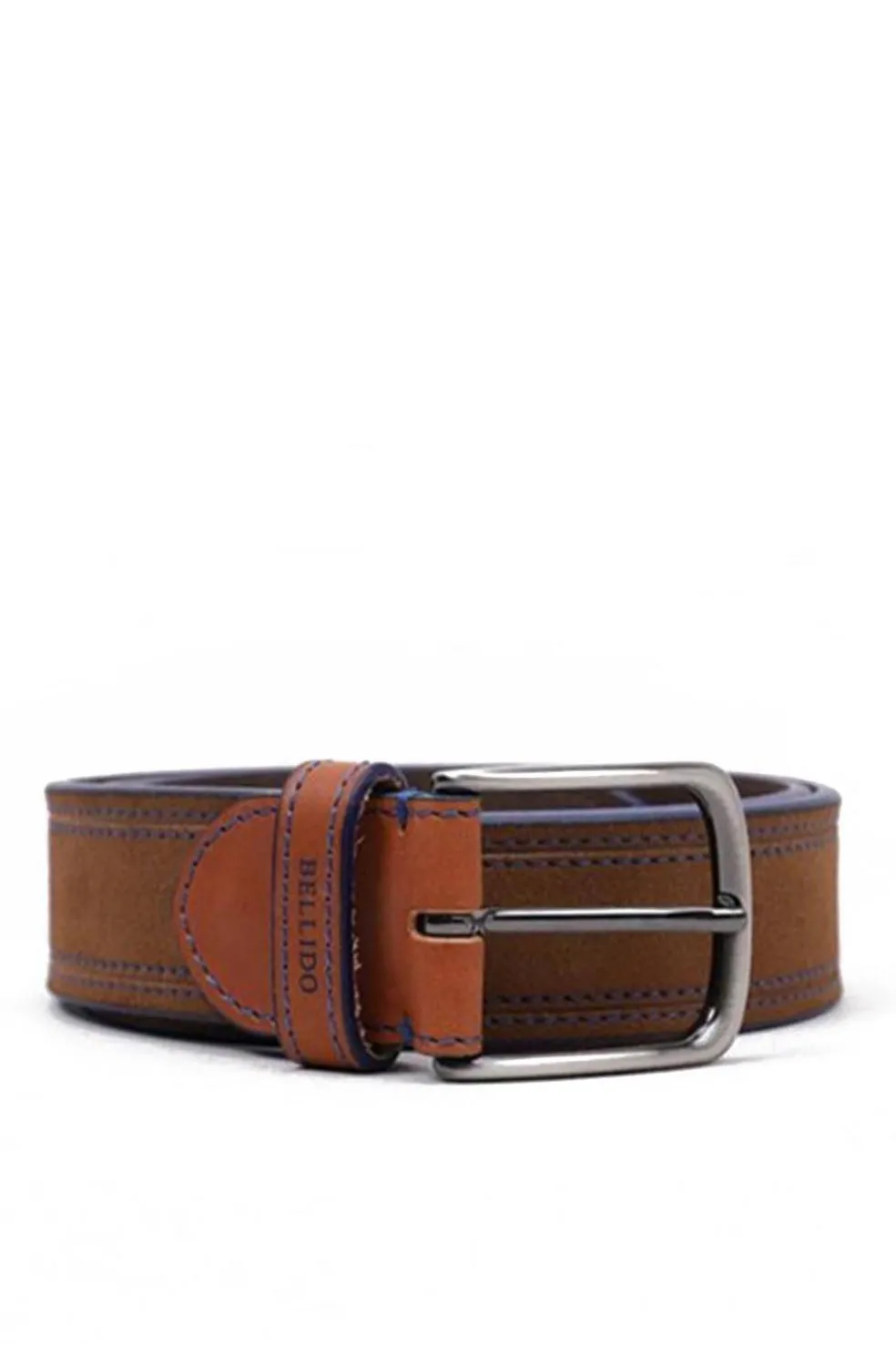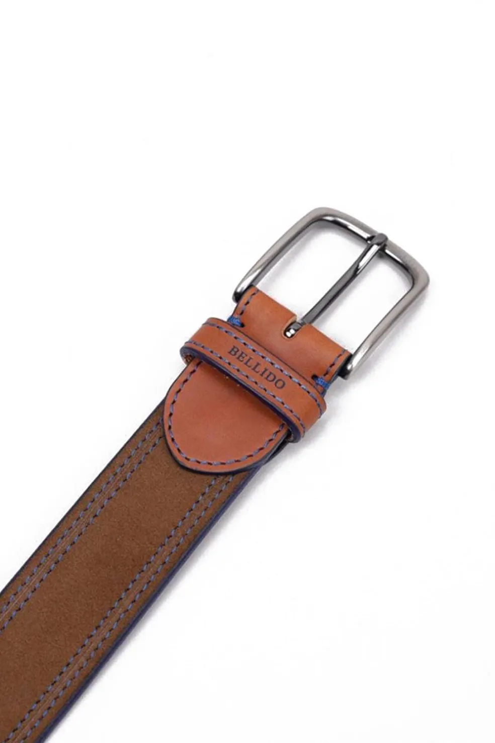 Cinturón en 38mm de anchura de piel de serraje combinado con piel de vacuno. El diseño de este modelo lo protagonizan los pespuntes en contraste con el color de la piel. Logotipo en color grabado a fuego en el pasador. Sistema sencillo de corte para ajustar a la medida deseada. La medida es la longitud desde el primer agujero hasta el final (sin contar la hebilla). Se puede acortar.