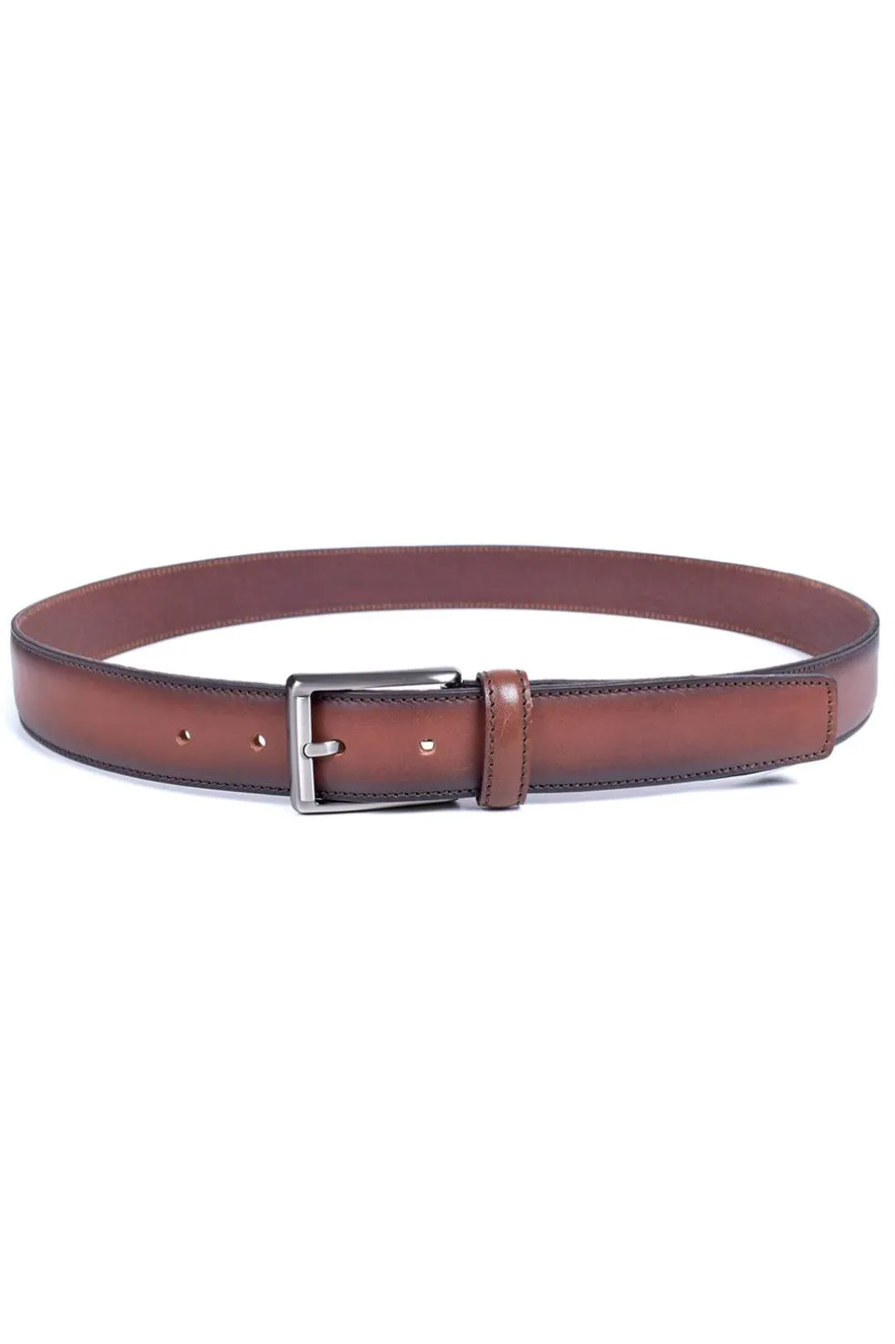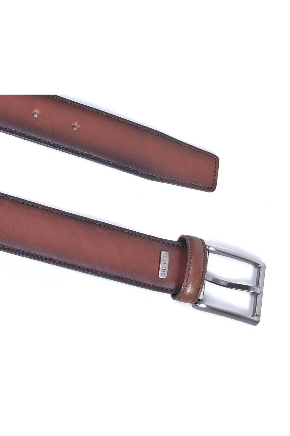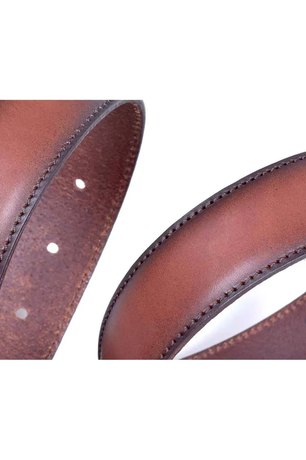 Cinturón de piel vacuno fabricado en España. Destaca el diseño sin costuras en la tira. Aplique metálico que sirve de adorno y para facilitar el corte del cinturón para adecuar la talla.