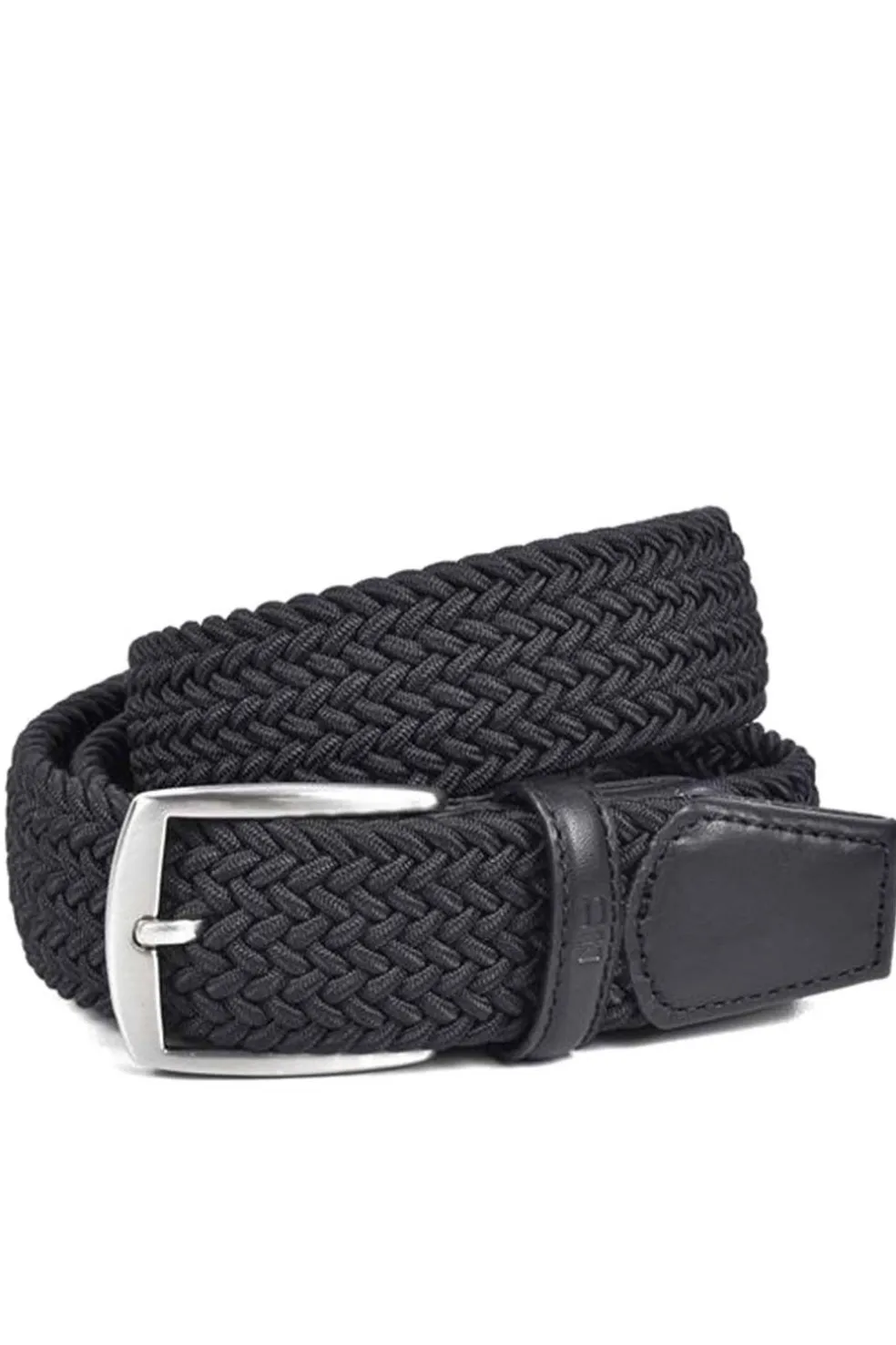 Cinturón textil trenzado con detalles en auténtica piel de vacuno. Su elasticidad facilita un cómodo ajuste en la cintura. Un modelo muy versátil, que se abrocha en la misma trenza. Pasador de piel identificado a fuego con la marca. Hebilla metálica en acabado níquel satinado