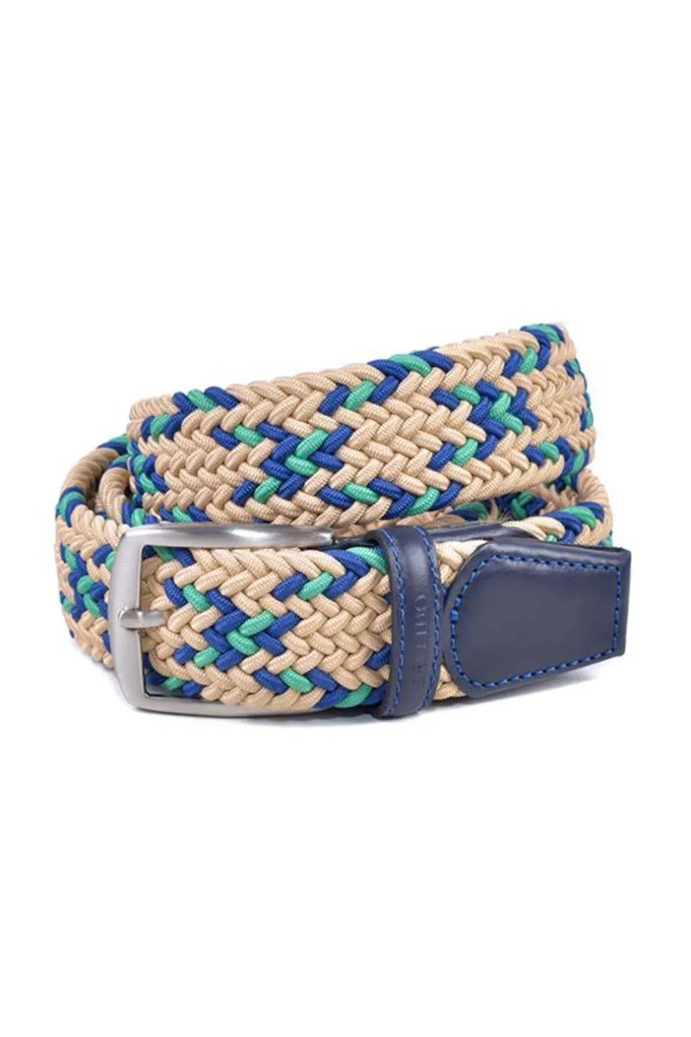 Cinturón textil trenzado, con detalles en auténtica piel de vacuno. Su elasticidad facilita un cómodo ajuste en la cintura. Un modelo muy versátil, que se abrocha en la misma trenza. Pasador de piel identificado a fuego con la marca. Hebilla metálica en acabado níquel satinado.
