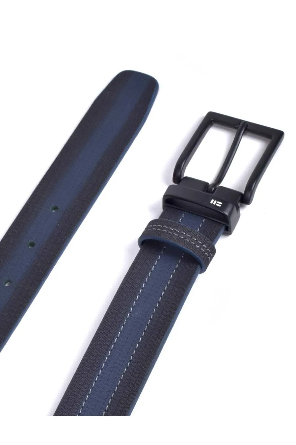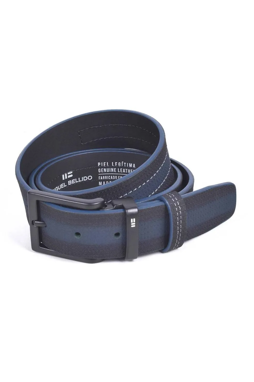 Cinturón en 35mm de piel de vacuno grabado en color negro en los cantos y azul en el centro. Hebilla en acabado negro con pasador metálico incorporado identificada con el logotipo a láser en color blanco. Sistema sencillo de corte para adaptar a la medida deseada.