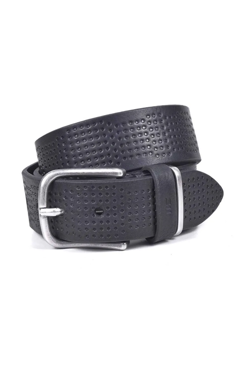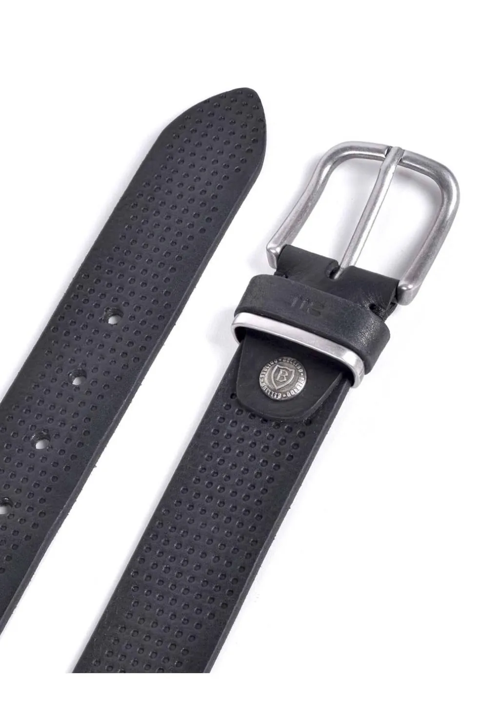 Cinturón en 40mm de piel de vacuno grabado a lo largo de toda la tira. Tiene dos pasadores, uno de piel identificado a fuego con el logotipo y otro metálico. Sistema de corte sencillo para ajustar a la medida deseada. Este sistema queda oculto al abrochar el cinturón