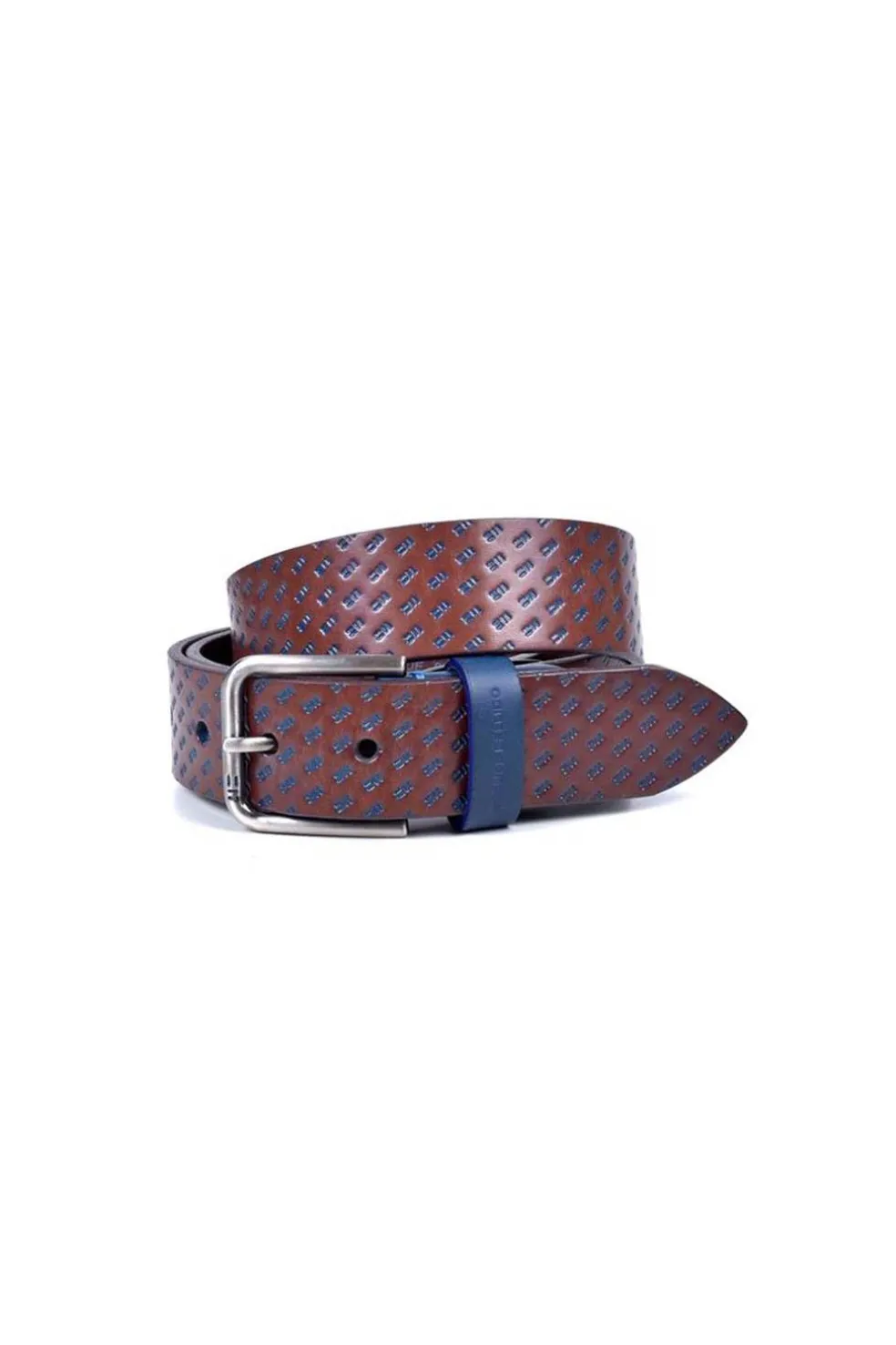 Cinturón en 35mm de piel de vacuno grabada con el logotipo a fuego en color azul en contraste con el color marrón de la piel. La marca en color grabada a fuego en el pasador. Sistema sencillo de corte para ajustar a la medida deseada. Este sistema realizado en piel lleva superpuesto el logotipo en un material especial. Se oculta cuando se abrocha el cinturón.