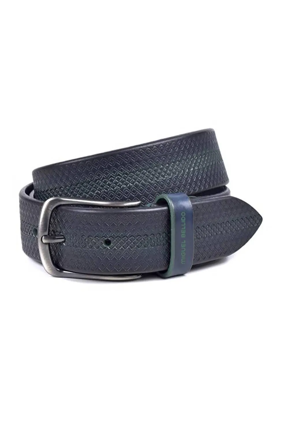 Cinturón en 35mm de piel de vacuno grabada con diseño de motivos triángulares. Combinada con piel en contraste de color y difuminada. Marca identificada a fuego en el pasador. Sistema sencillo de corte para ajustar a la medida deseada. Este sistema realizado en piel lleva superpuesto el logotipo en un material especial.