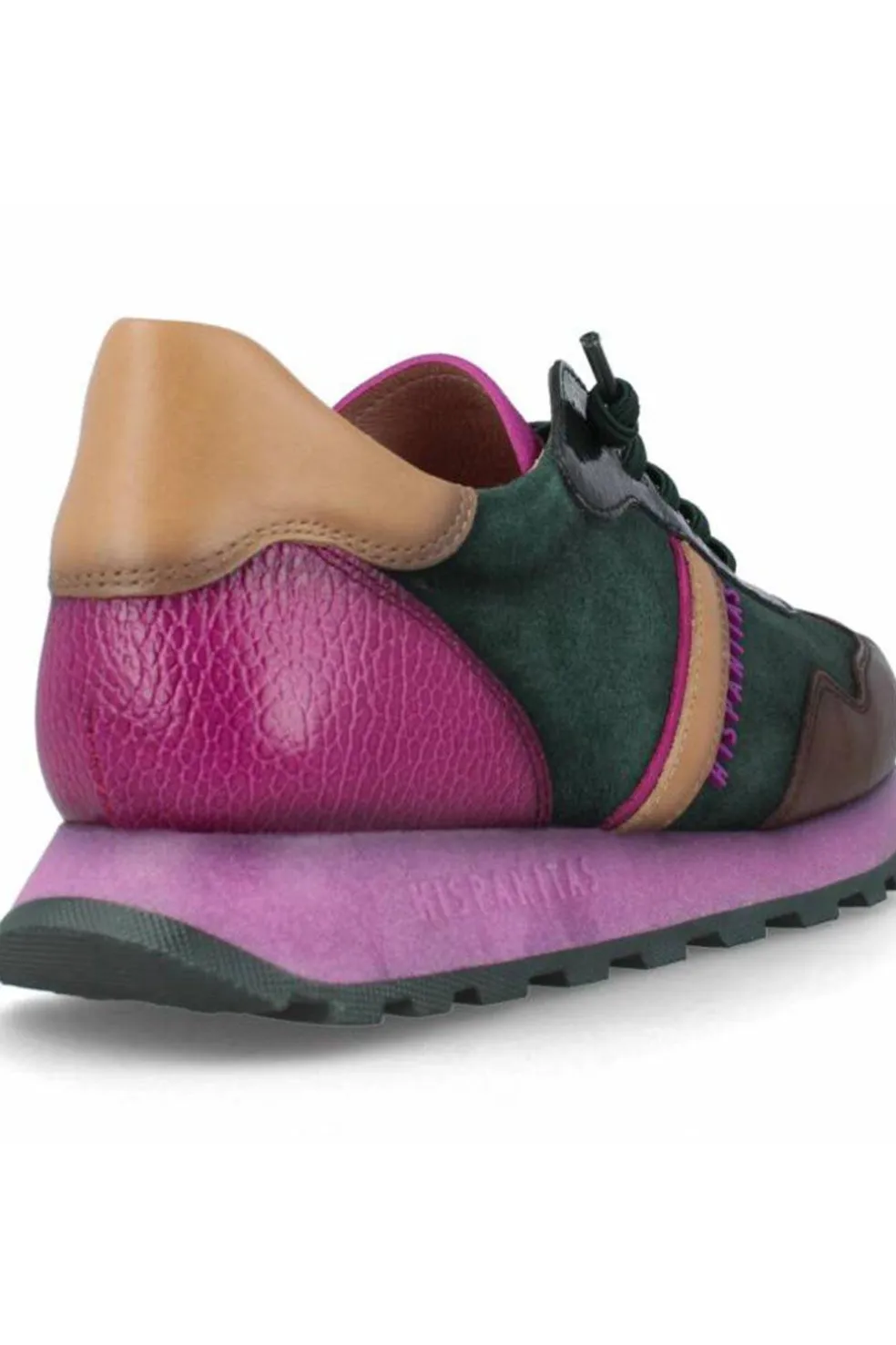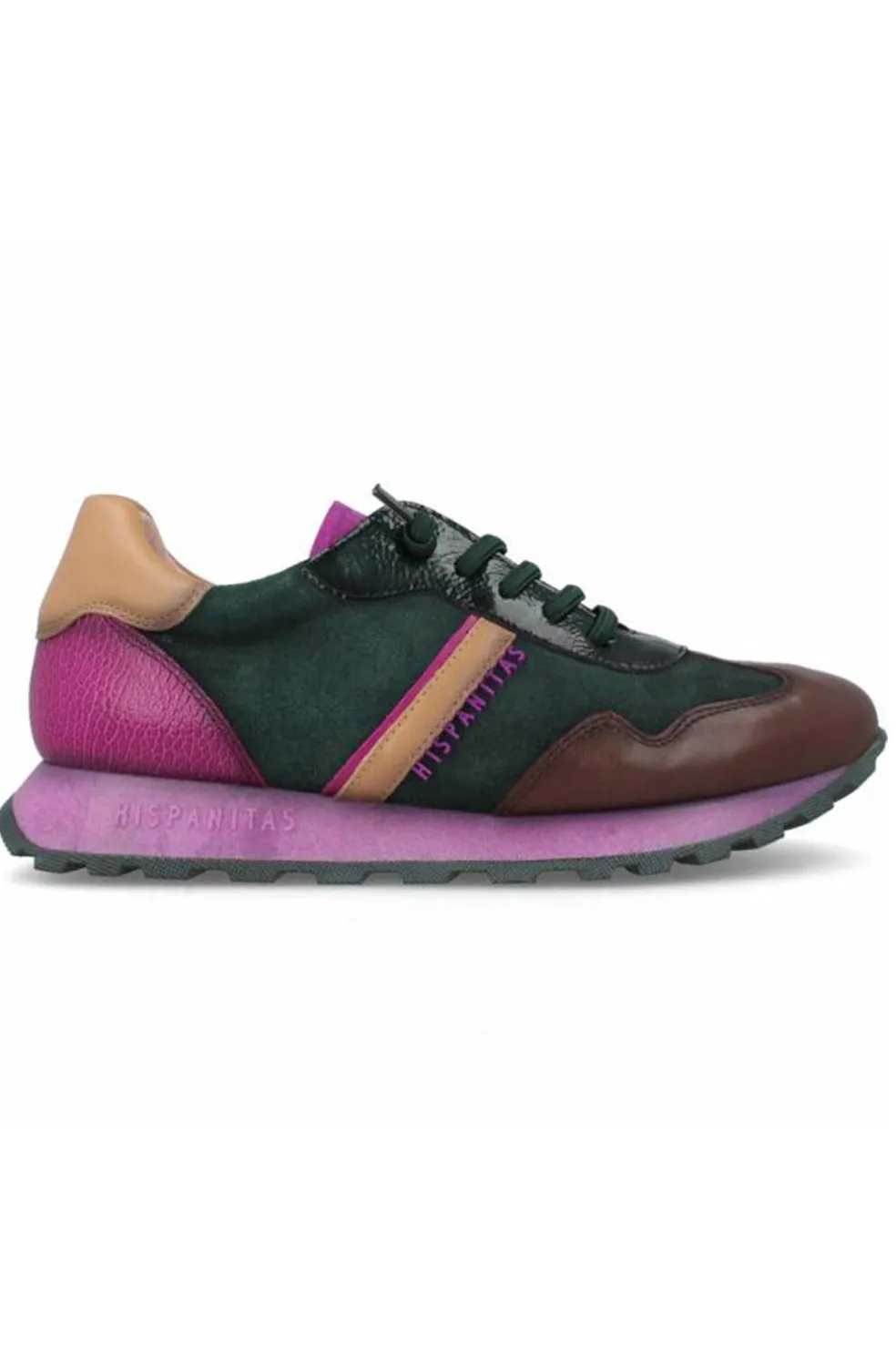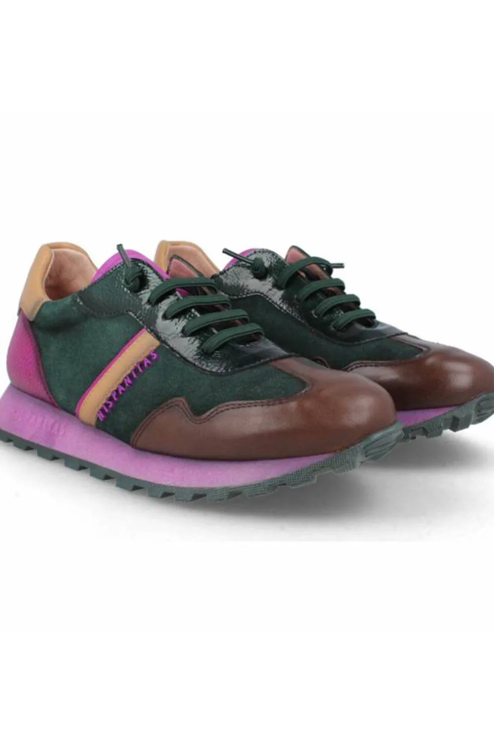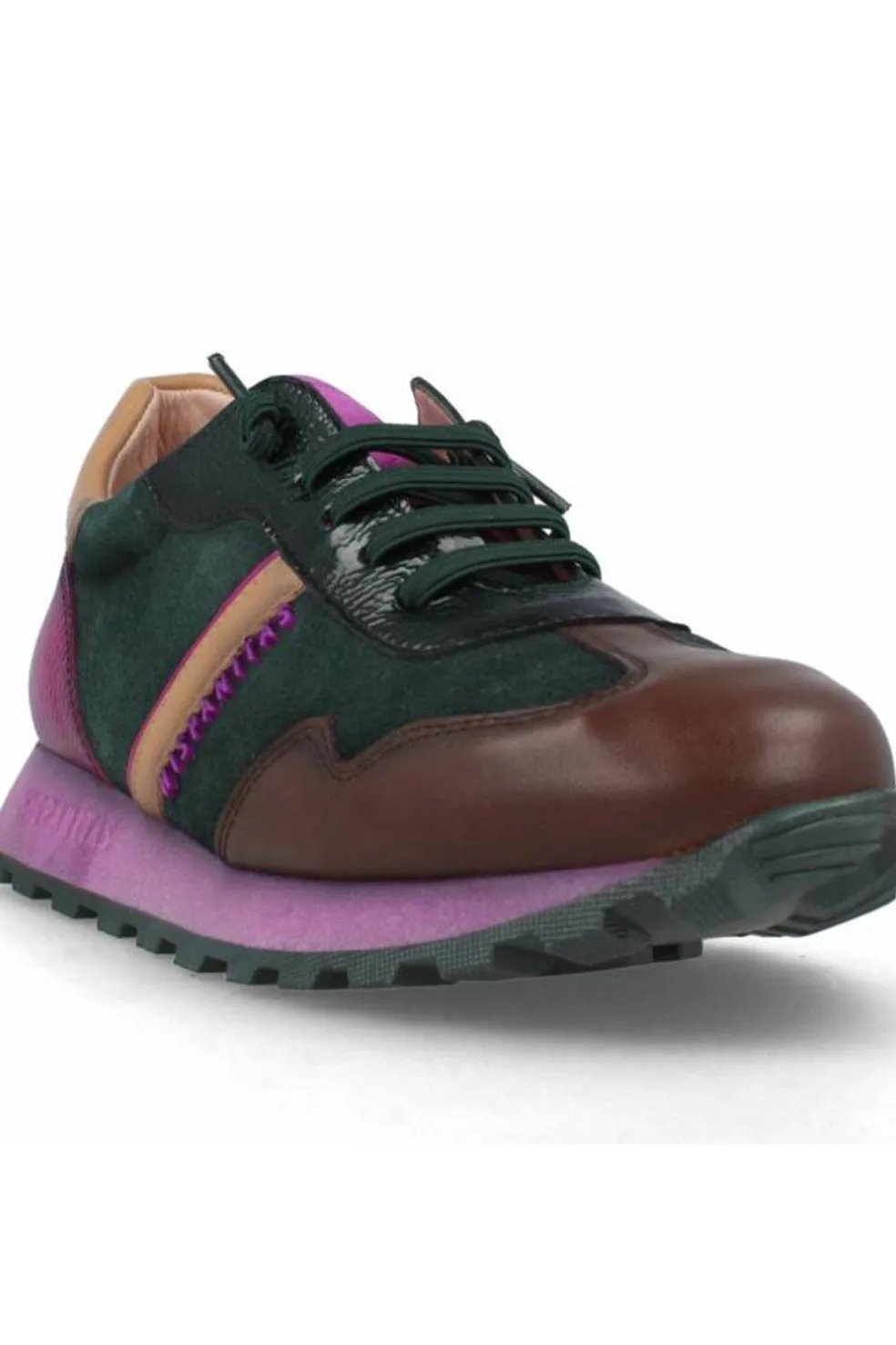 Deportiva elaborada en combinación de colores,verde, marrón,beige y morado.