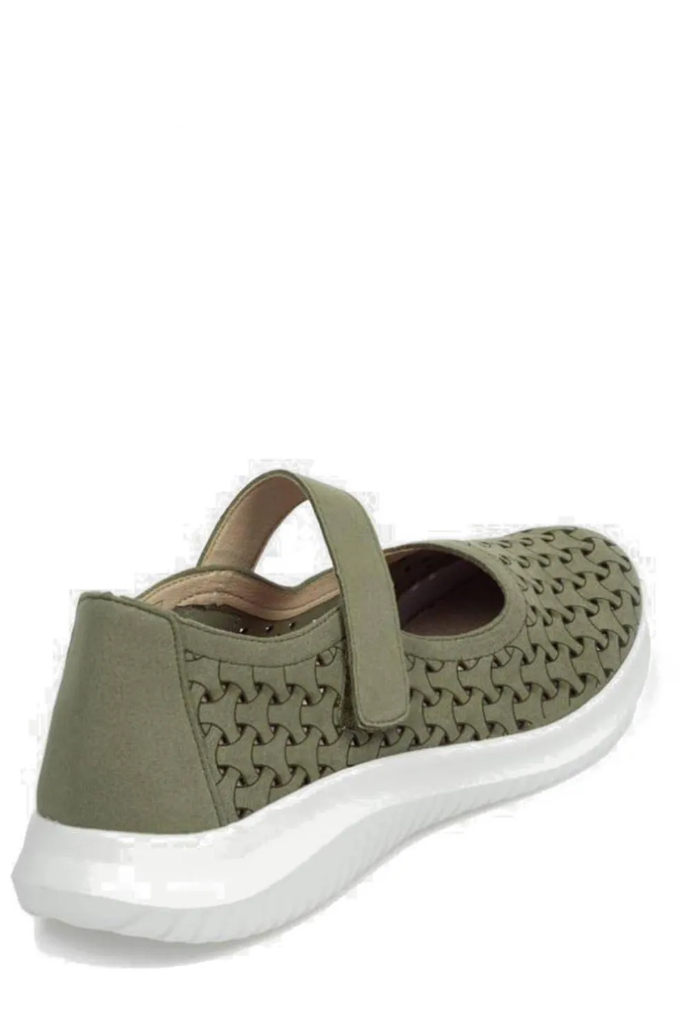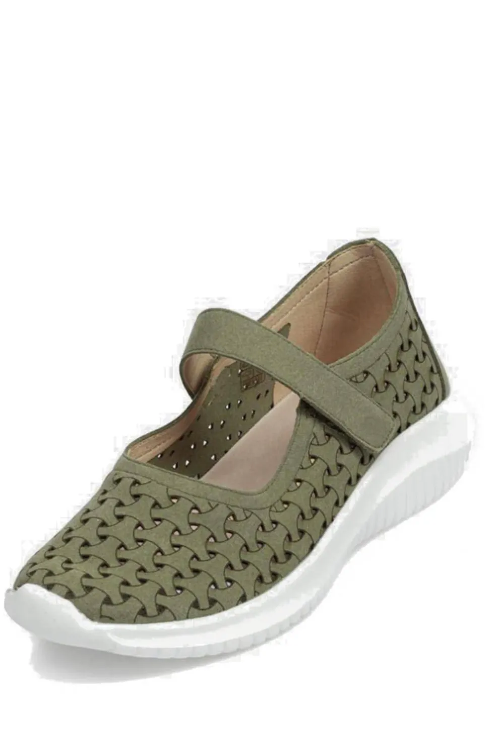 Zapatilla muy ligera. Combinable con ropa de verano. Cómoda y transpirable, con cierre de velcro. En color verde kaki y suela blanca.