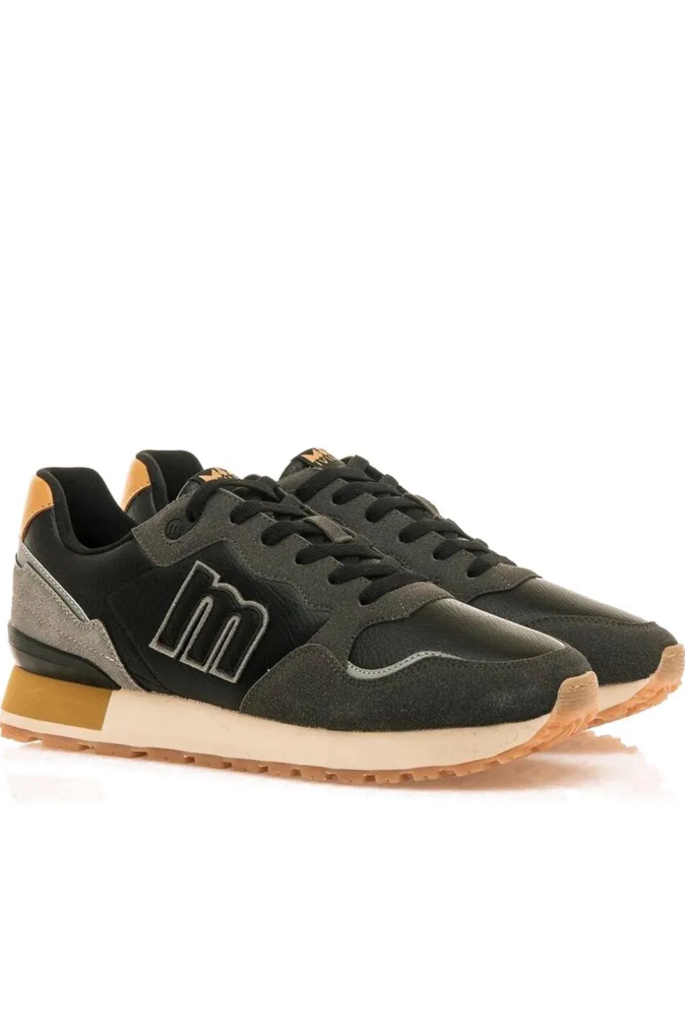 Zapatilla deportiva Joggo Classic Mustang para hombre. Fabricada en color negro con detalles en color mostaza y gris. Piso con mayor estabilidad en las pisadas gracias a su planta foam y a su puntera ligeramente elevada. Cierre de cordones planos. Nombre de la marca en la trasera y lengüeta, logo en el lateral. Comodidad y ligereza para hacer frente a los retos de cada día.