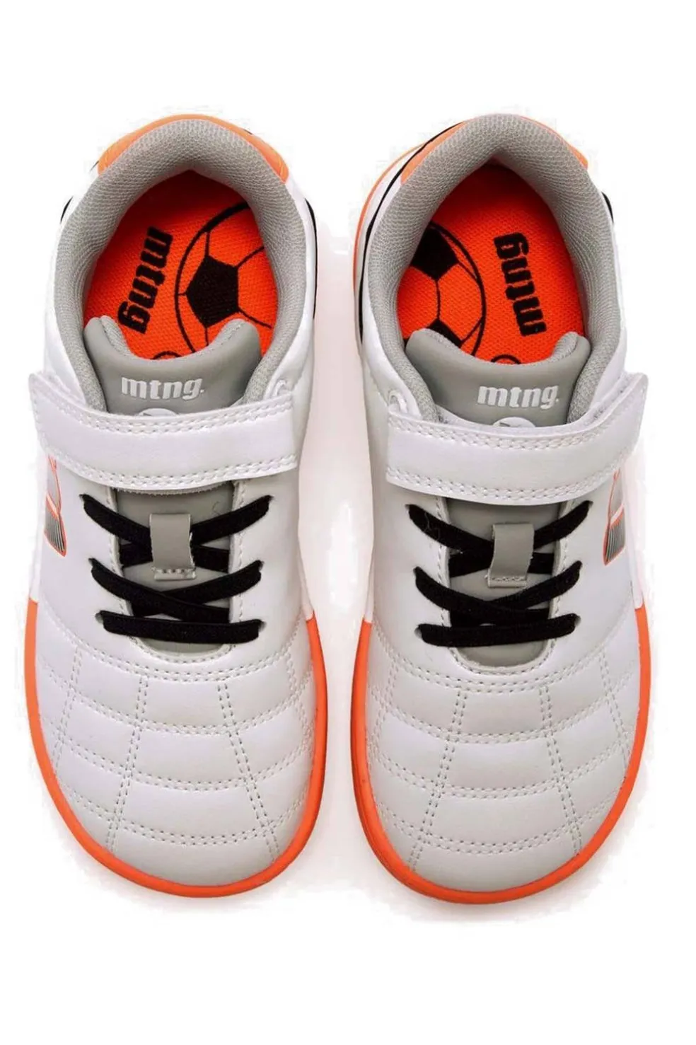 Zapatilla de fútbol barefoot de color blanco con detalles en naranja y negro para niño, modelo Free Play de Mustang. Incorpora puntera reforzada que protege el corte frente a la abrasión por contacto con el suelo. Dispone de cierre adherente con cosido reforzado y cordones elásticos que facilitan el ajuste. La suela de goma incluye pequeños tacos que mejoran la tracción y el agarre. Diseñado y desarrollado especialmente en colaboración con el Dr. Juanjo López, traumatólogo deportivo e infantil, para respetar el desarrollo natural del pie del niño y la niña.