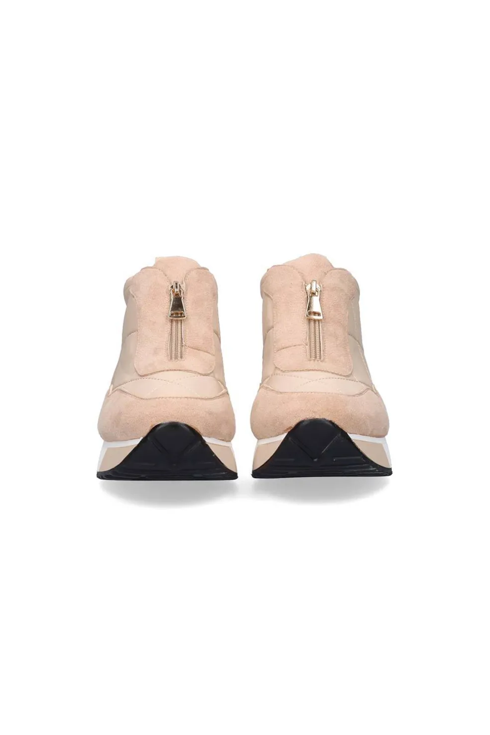 Sneaker en color beige. Su corte y plantilla son de material textil, la suela es de material sintético. La suela mide 4 cm y tiene cierre de cremallera.