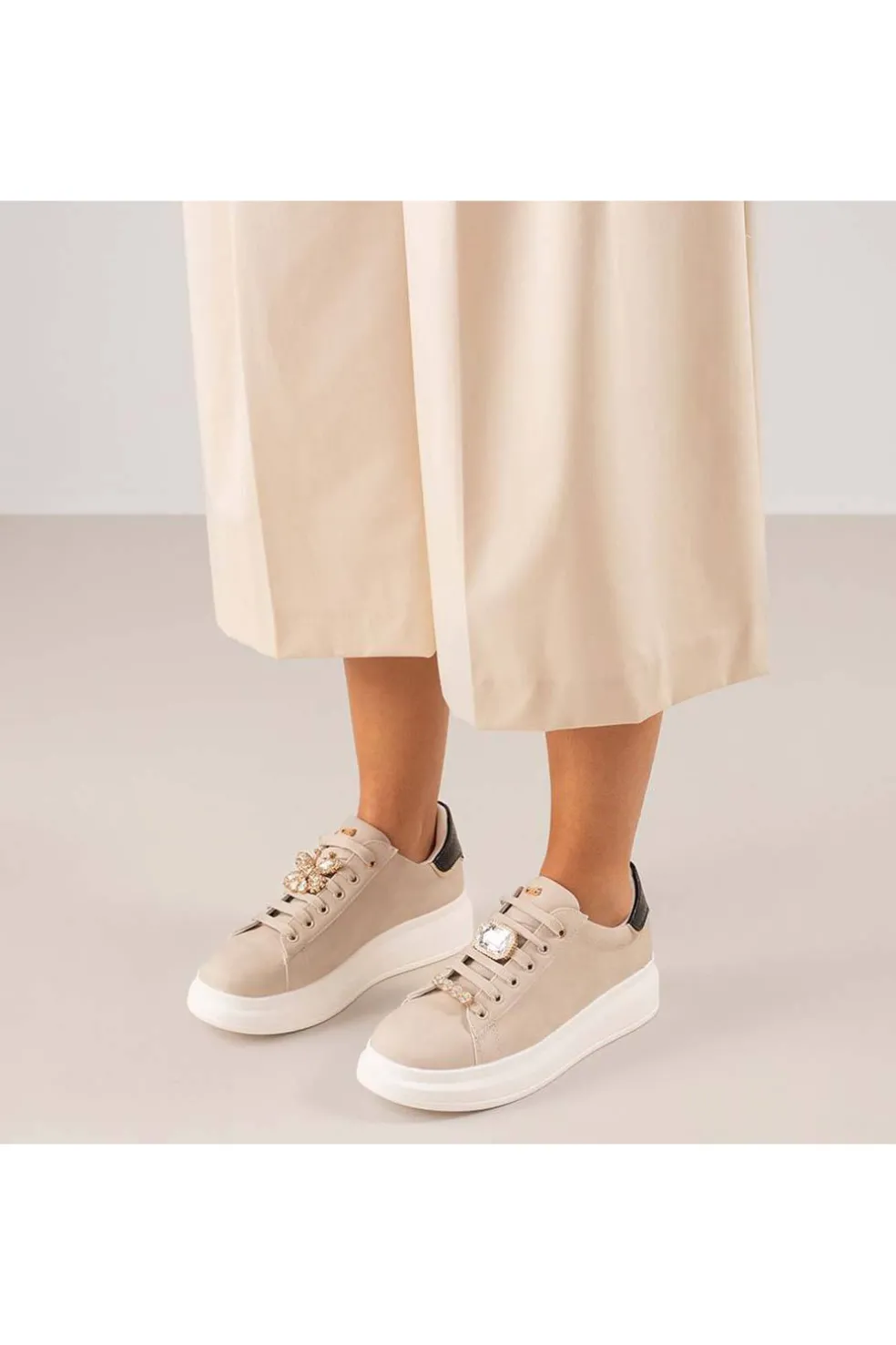 Las deportivas en colores neutros son el mejor comodín para los looks del día a día. Por eso, os presentamos este precioso diseño de color offwhite completado con unos preciosos adornos joya. Aportarán a tus estilismos un carácter atrevido y desenvuelto.