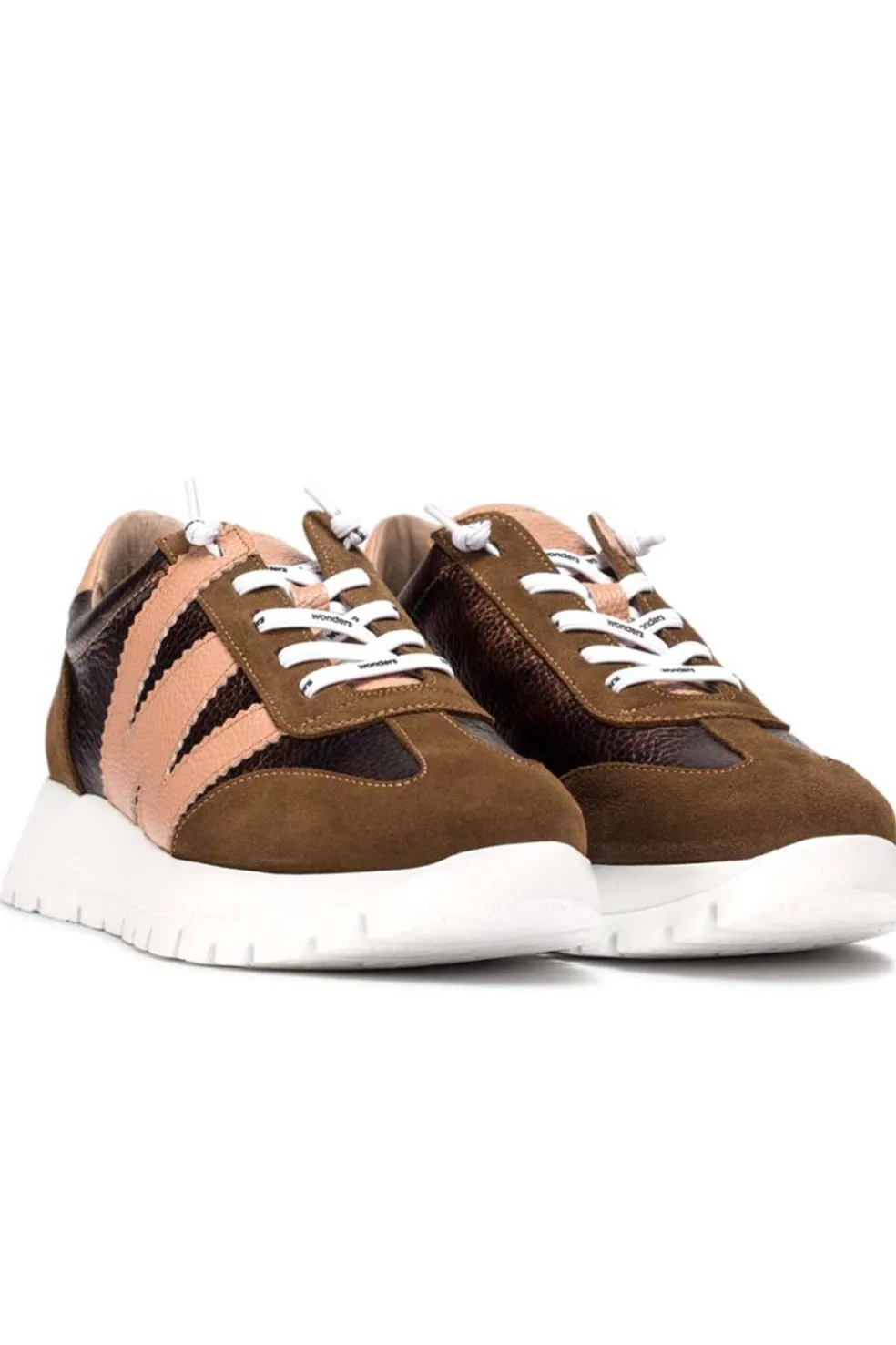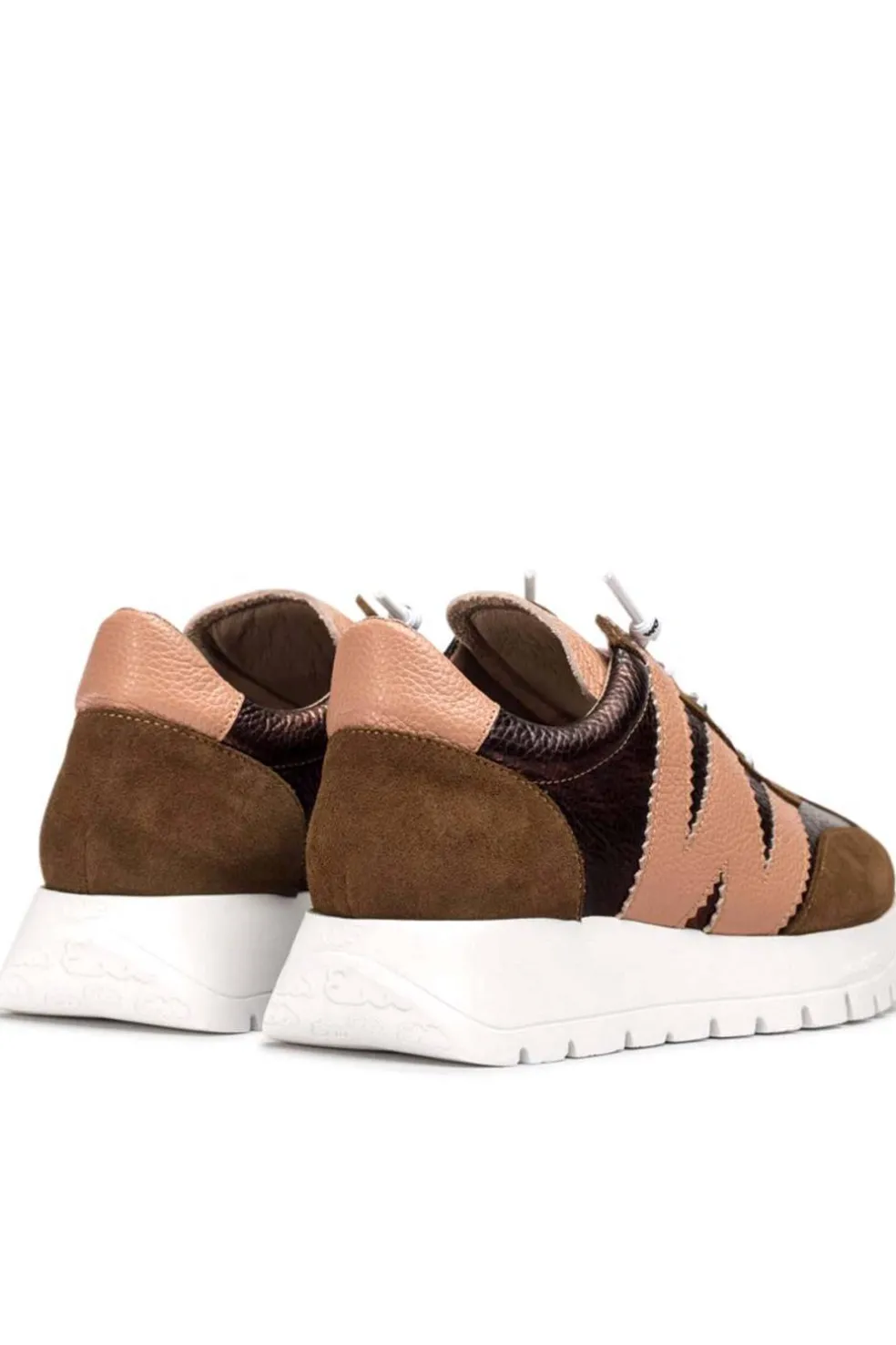 Deportivas ODISEI 76 fabricadas en una combinación de pieles en color marrón y rosa maquillaje.