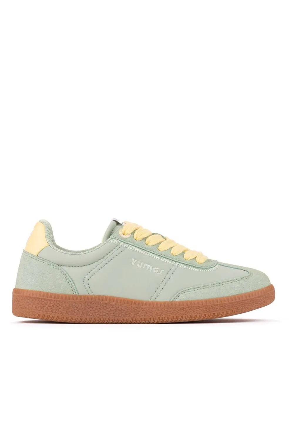 Zapatilla mujer con corte serraje sintético combinado en nylon, detalle de talón y cordón en amarillo.