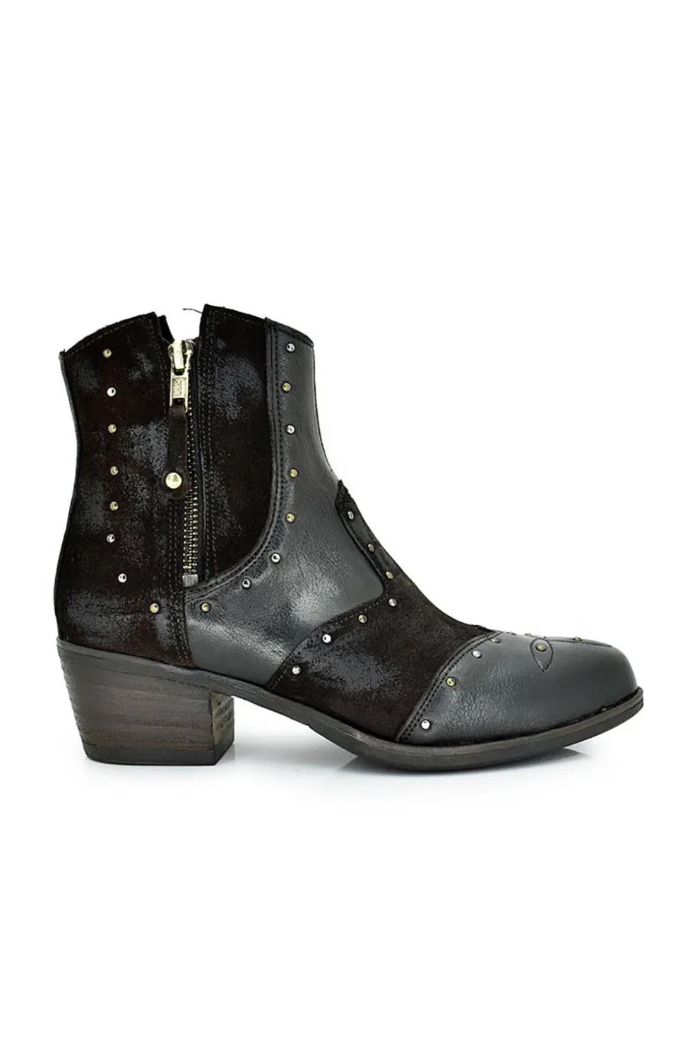 Botín de piel estilo campero que combina piel bordada.