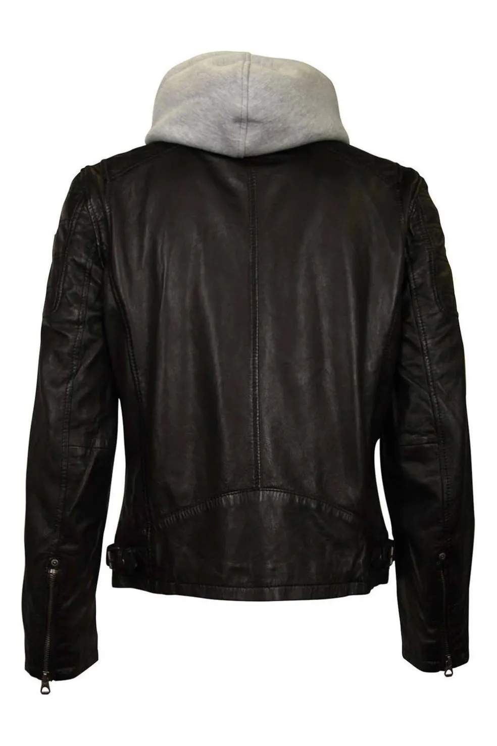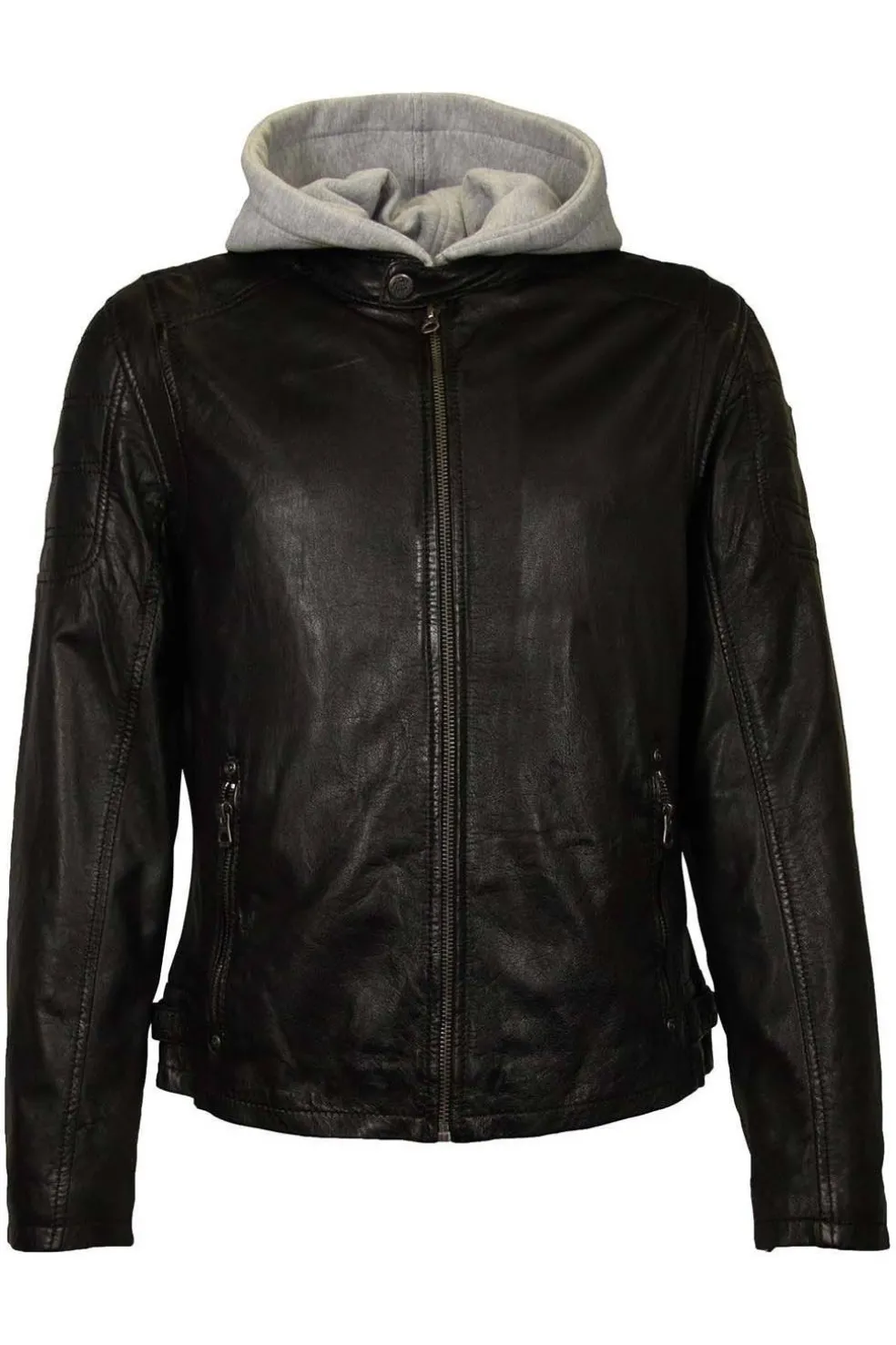 Cazadora de piel natural sin cromo con un toque envejecido, vintage. La capucha es desmontable.