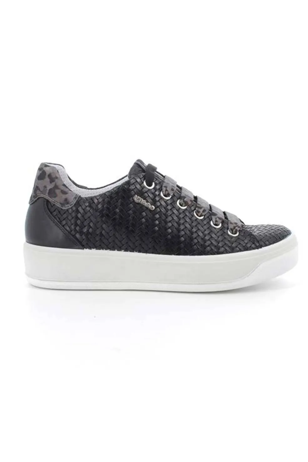 Deportivo mujer de piel natural con detalle trenzado. Detalle animal print en talón y cordones.