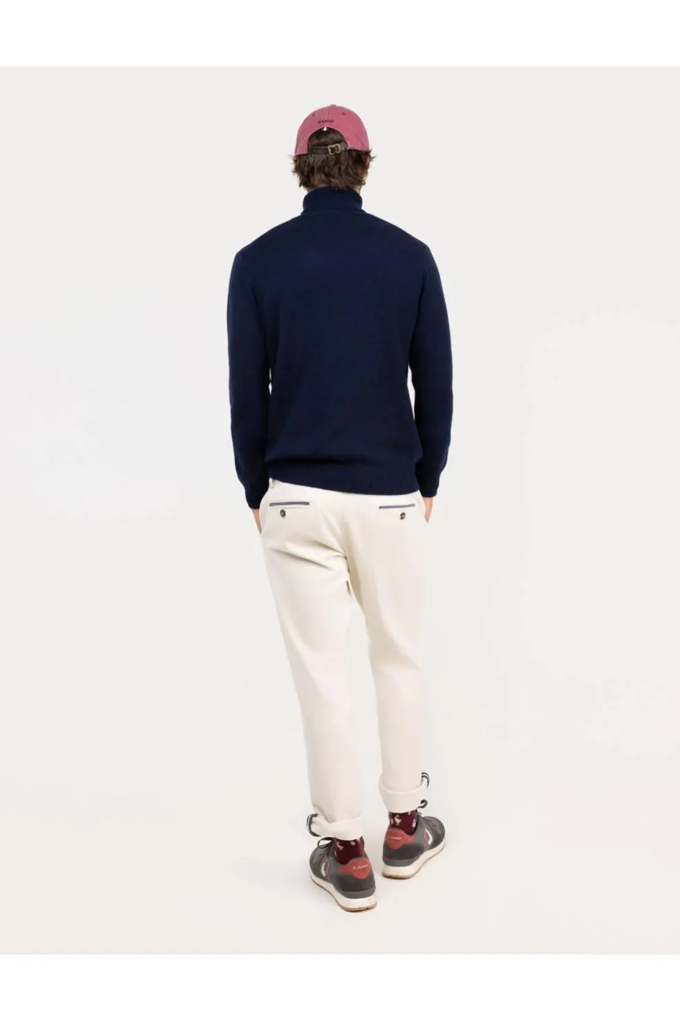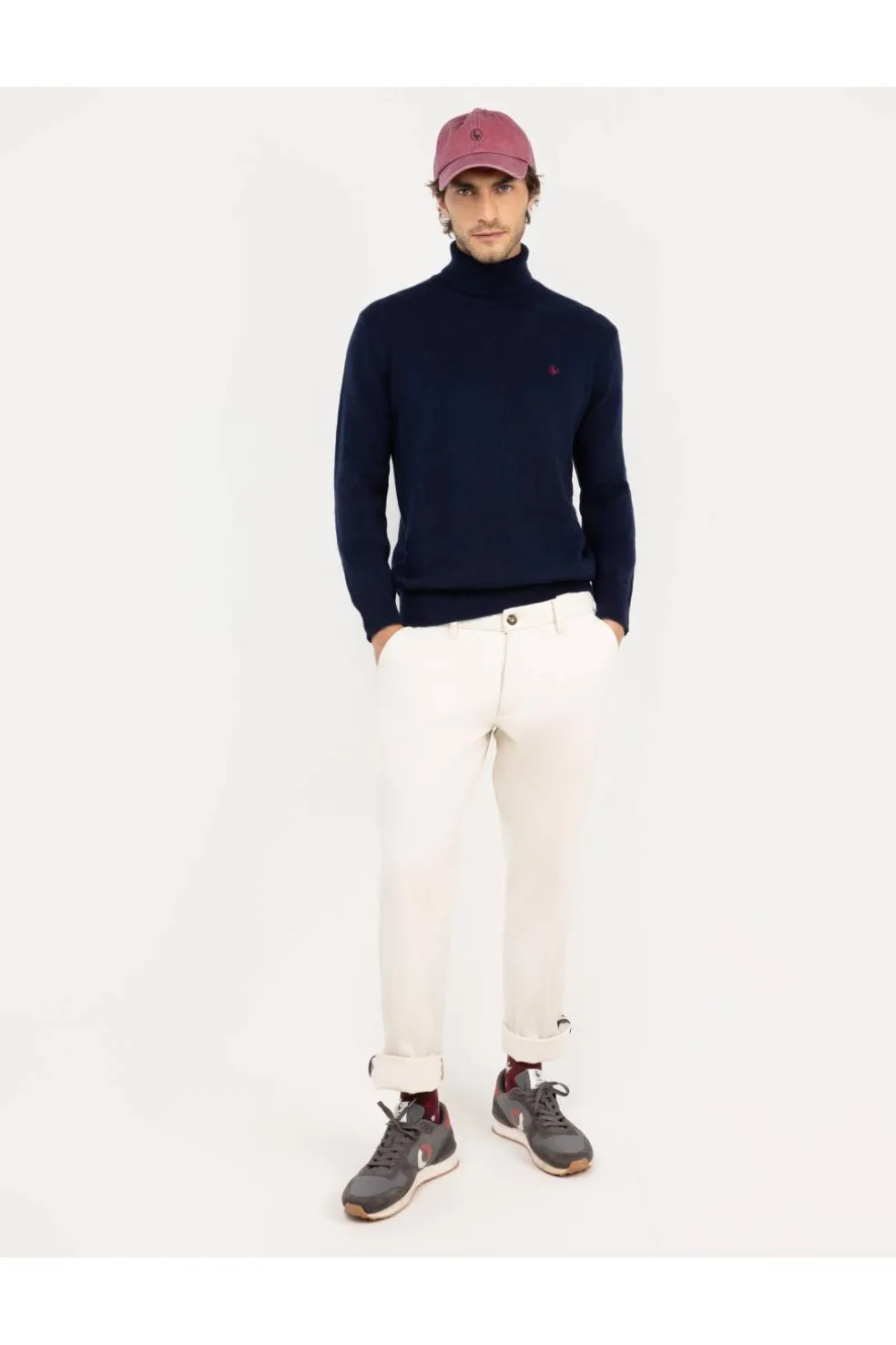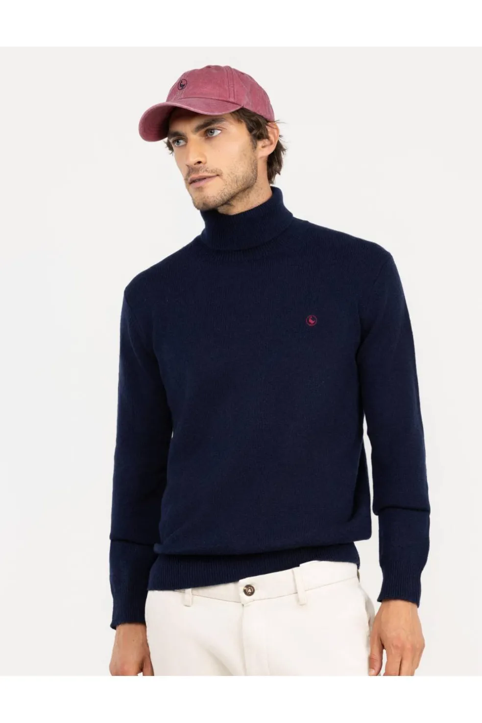 Jersey de hombre con cuello vuelto confeccionado con lana merino. Manga larga y contraste de franja ancha en bajo y puños. Corte Slim fit.