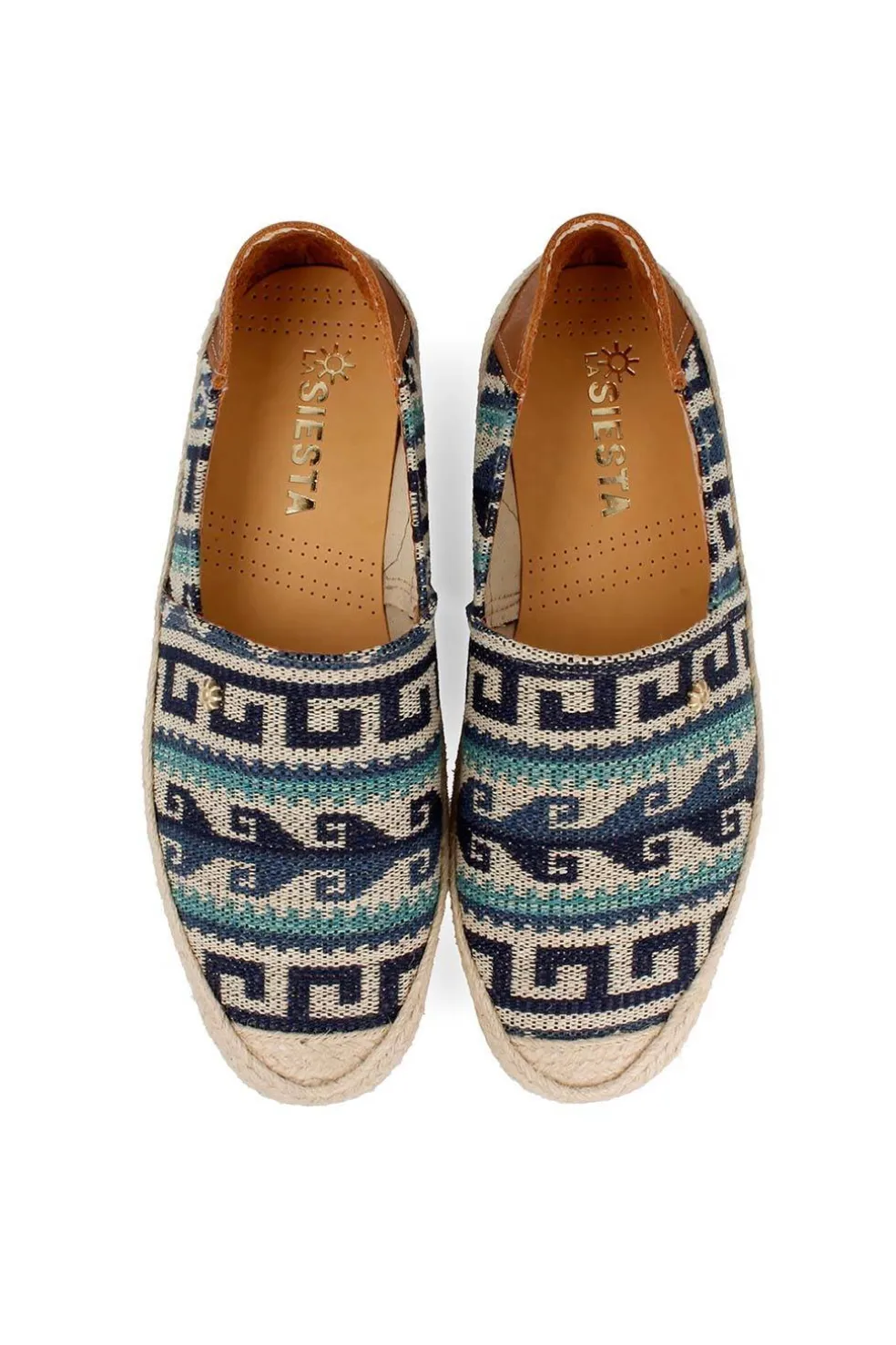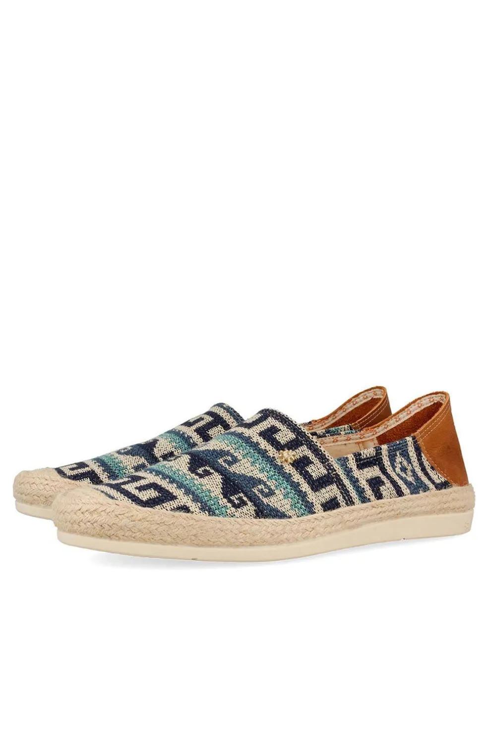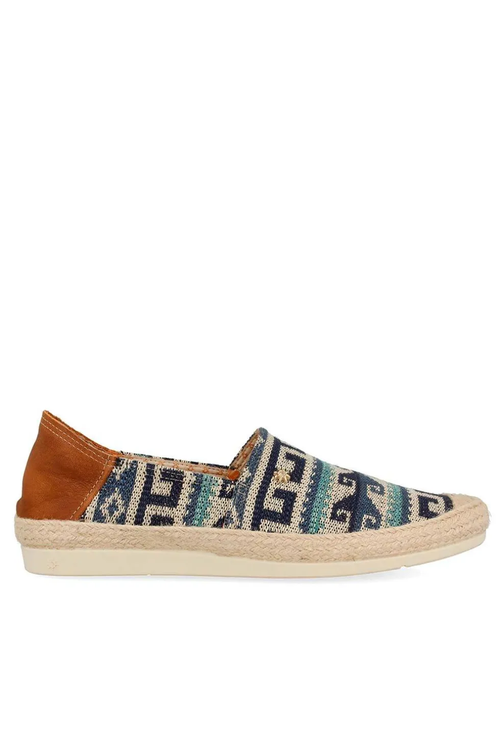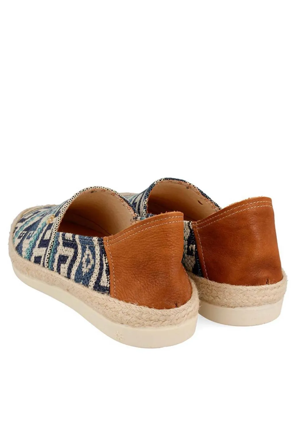 Alpargata en tejido étnico con apliques de cuero. Puntera reforzada de esparto.
