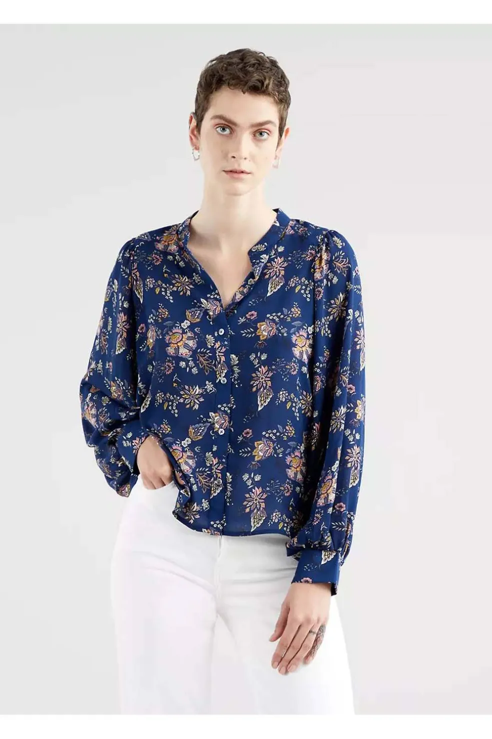 - Presenta botones delicados, mangas ligeramente abullonadas y detalles plisados intrincados