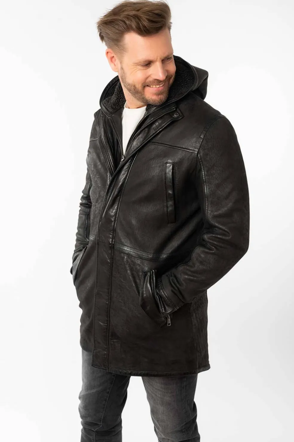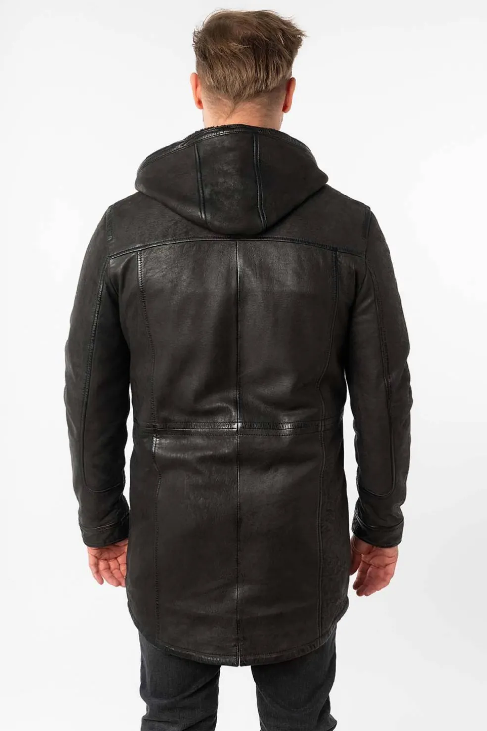 Elegante y funcional, esta levita de piel para hombre combina estilo y practicidad.