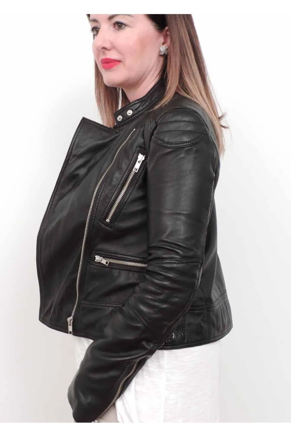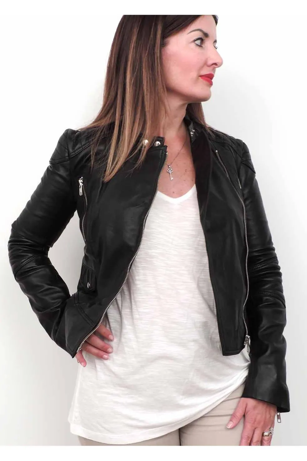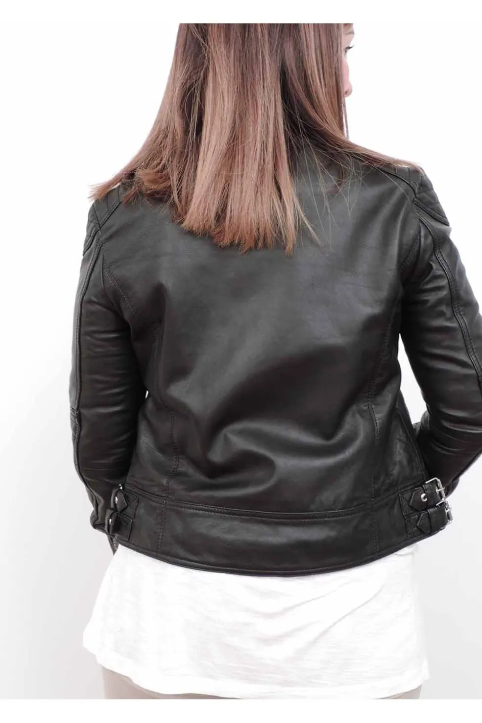 Cazadora de cuero natural con un acabado con aspecto vintage. La piel es muy suave y ligera.