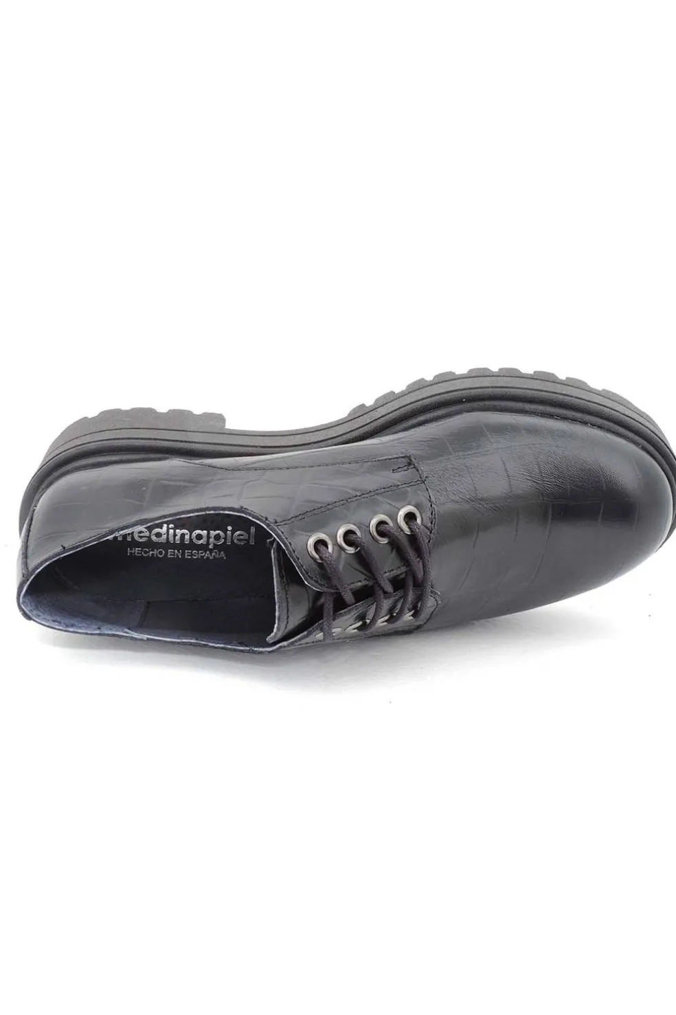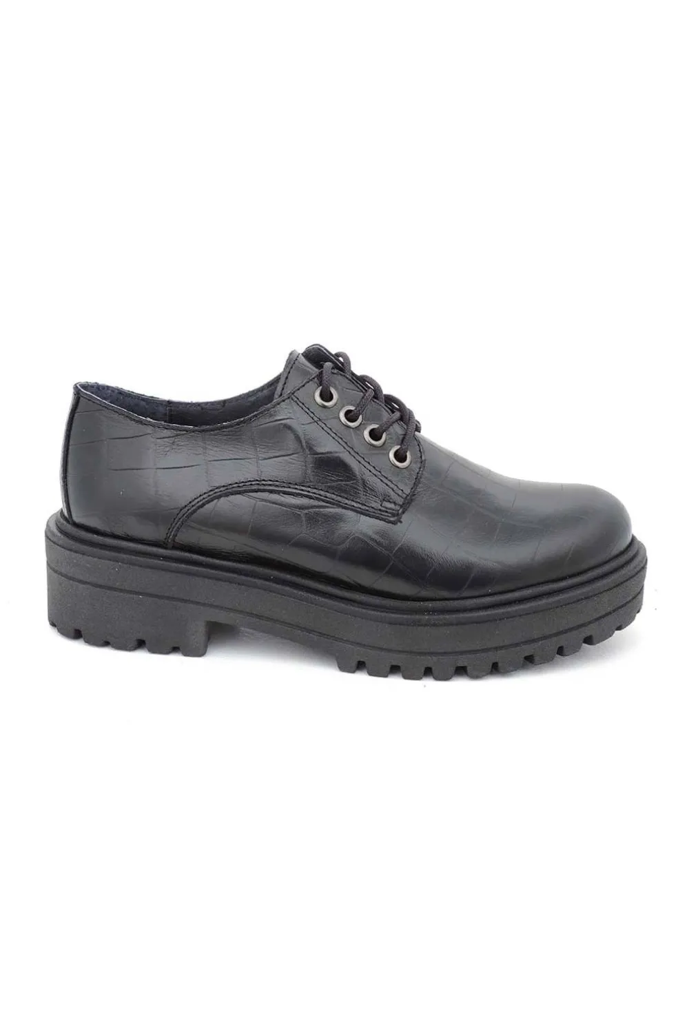 Zapato de piel en color negro con cierre de cordones redondos en el empeine y ojetes metálicos.
