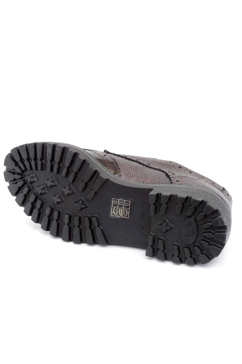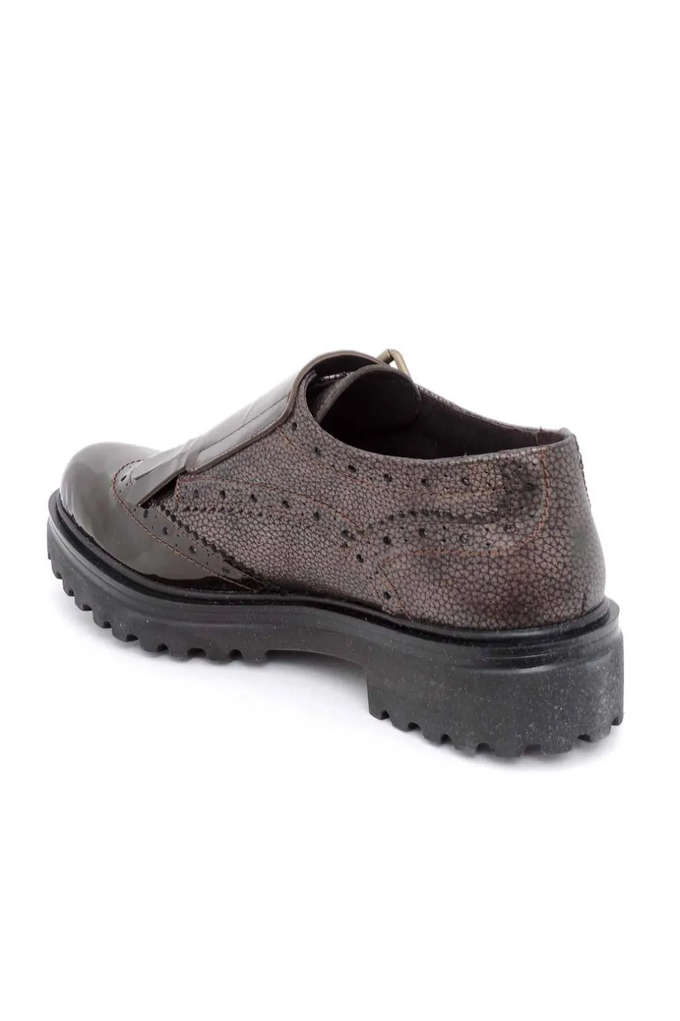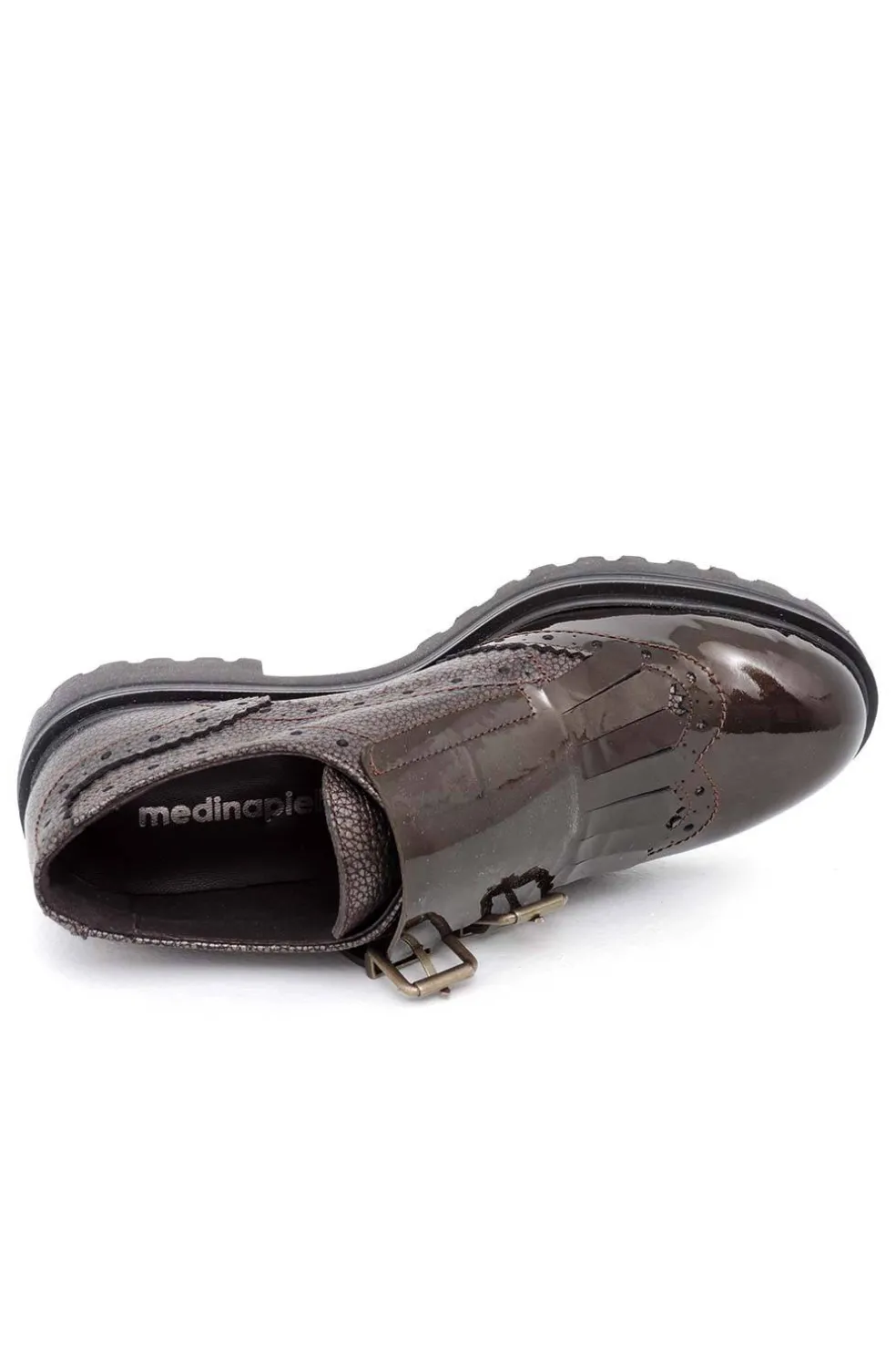 Zapato de piel estilo inglés con picados y flecos. Se abrocha con hebillas laterales. Piso grueso de goma antideslizante.