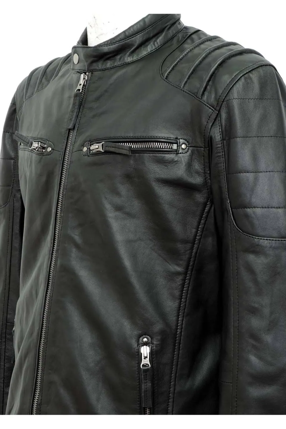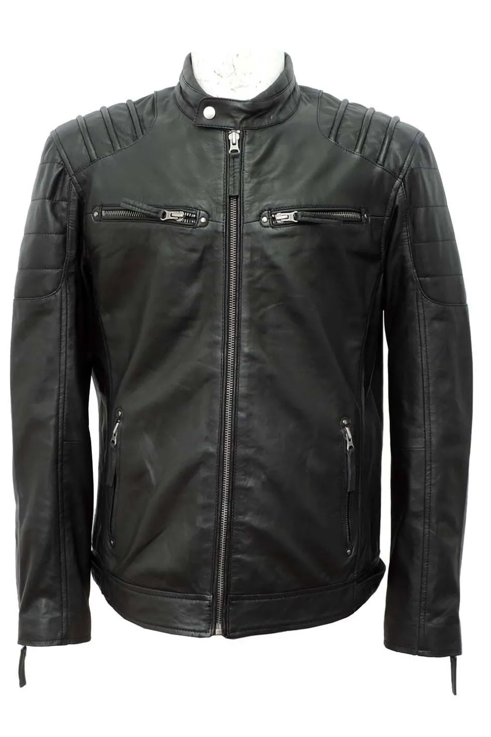 Cazadora de hombre en piel natural con línea motera. Aspecto vintage y piel muy suave. Destaca el cosido acolchado de los hombros.