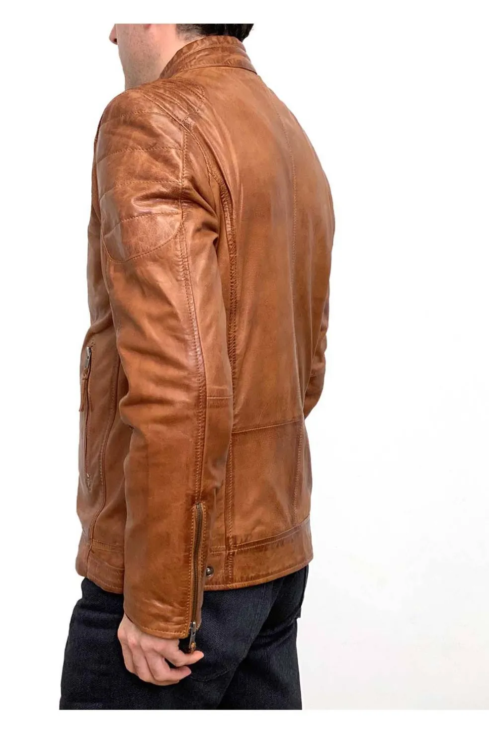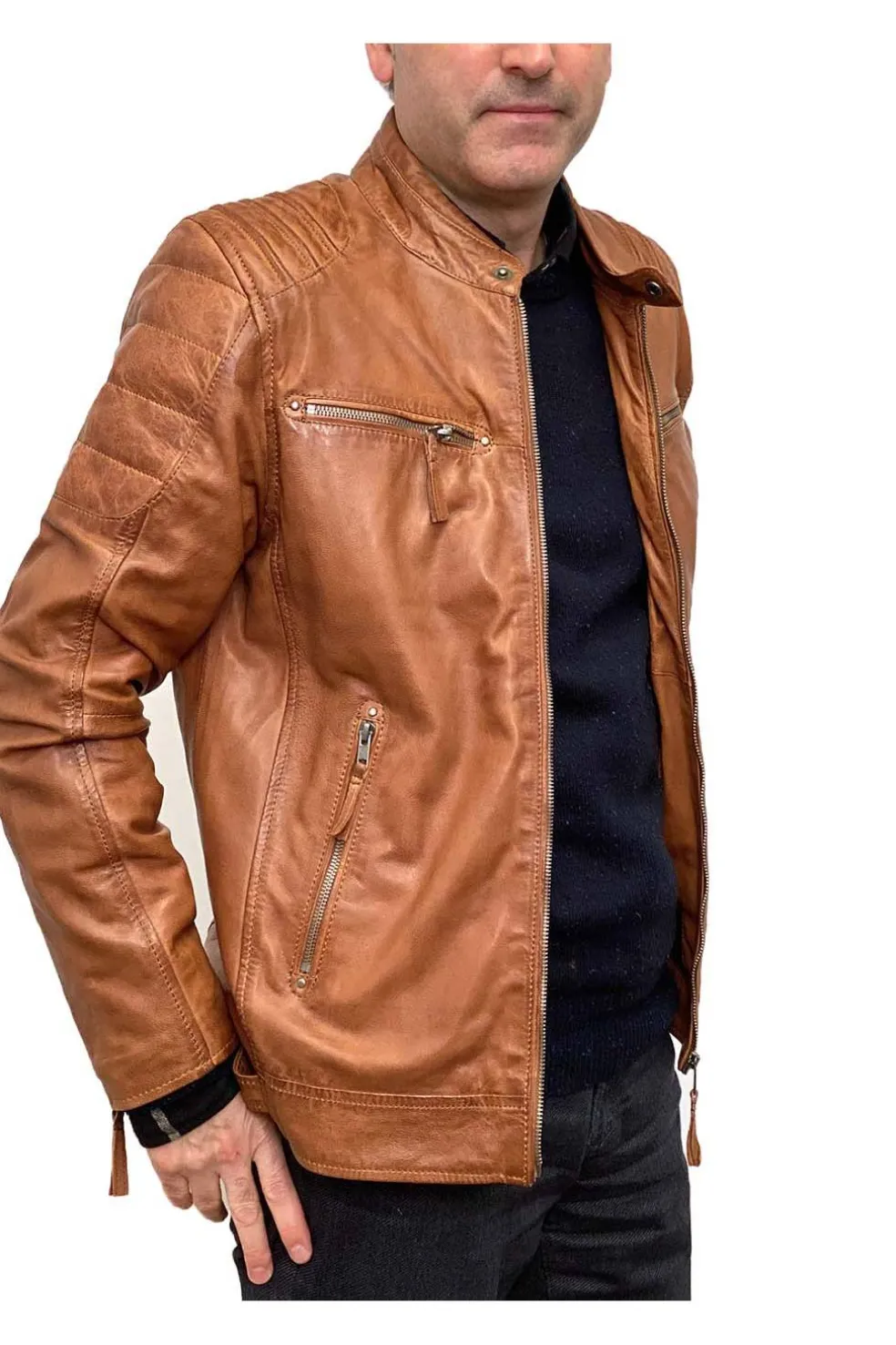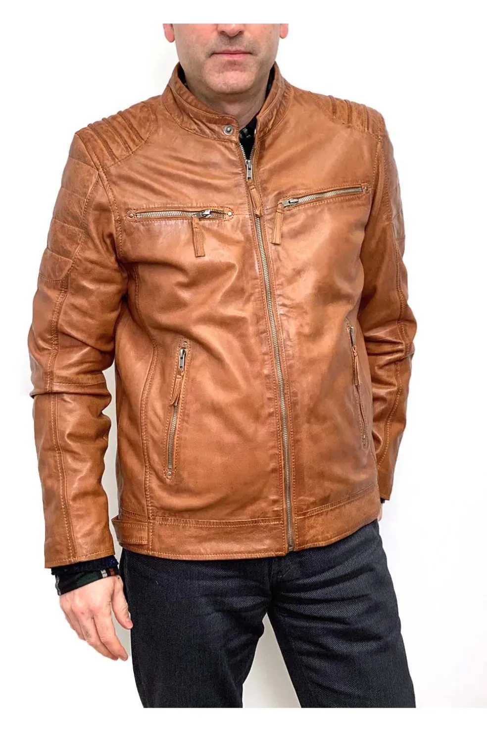 Cazadora de hombre en piel natural con línea motera. Aspecto vintage y piel muy suave. Destaca el cosido acolchado de los hombros.