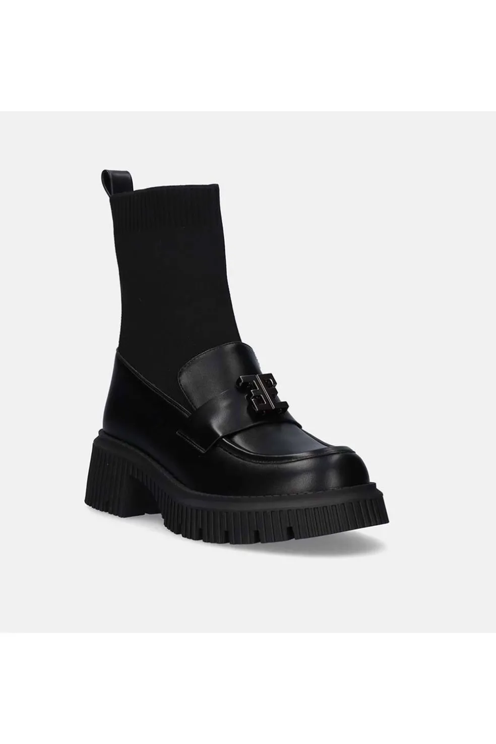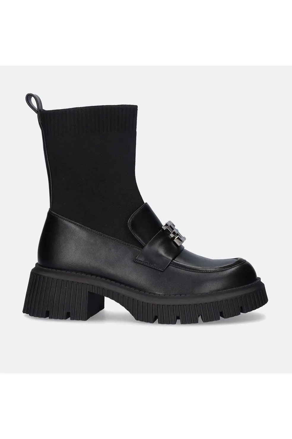 Mocasines en color black. Su corte y suela con de material sintético, la plantilla es de mateiral textil. Este diseño cuenta con un calcetín a modo de caña con una altura de 17 cm, además de contar con una gruesa suela de 6 cm de grosor para dar mayor confort.