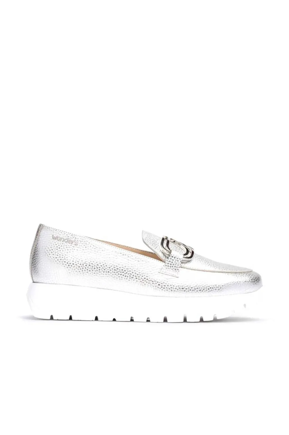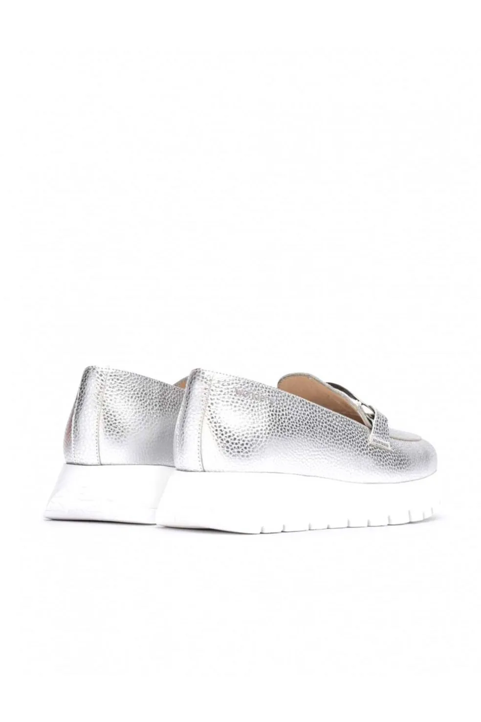 Mocasin en piel metalizada en color plata. Modelo clásico y atemporal con punta redondeada, detalle frontal en forma de cadena metalizada y plantilla extraible. Suela dentada desarrollada con tecnología WondersFly ™ que aporta una extrema ligereza y confort al modelo Sidney.